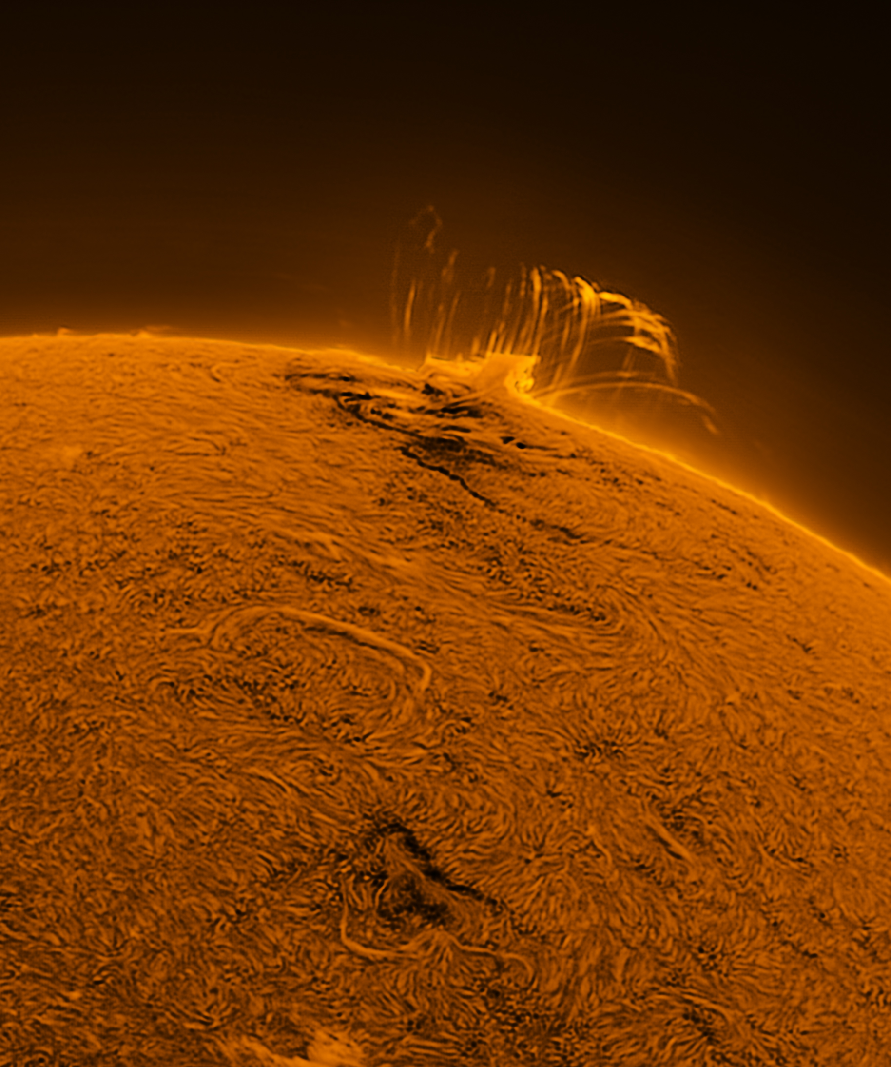 Es ist der Morgen am 18. Juli 2023: Die aktive Region 3363 steht am Westrand der Sonne. Darüber sind die Magnetfeldlinien als Protuberanzen schön sichtbar.