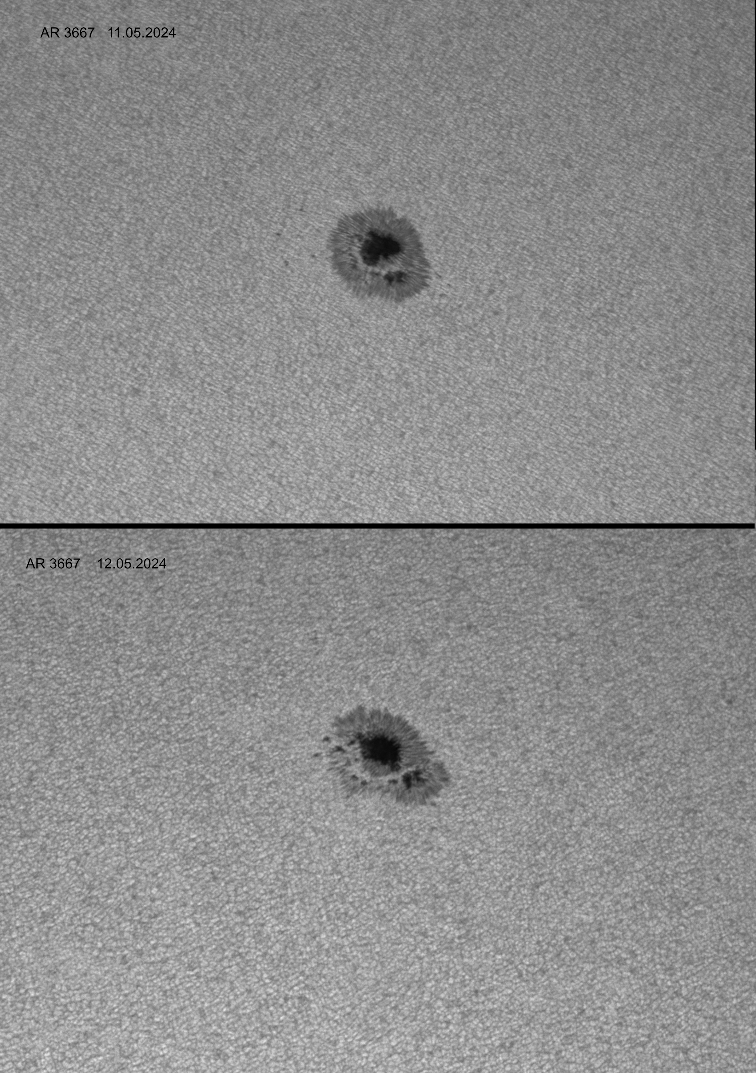 Nicht so imposant wie AR 3664 aber trotzdem mit einigen sehr interessanten Veränderungen zeigte ich AR 3667. Die beiden Bilder entstanden am Vormittag.