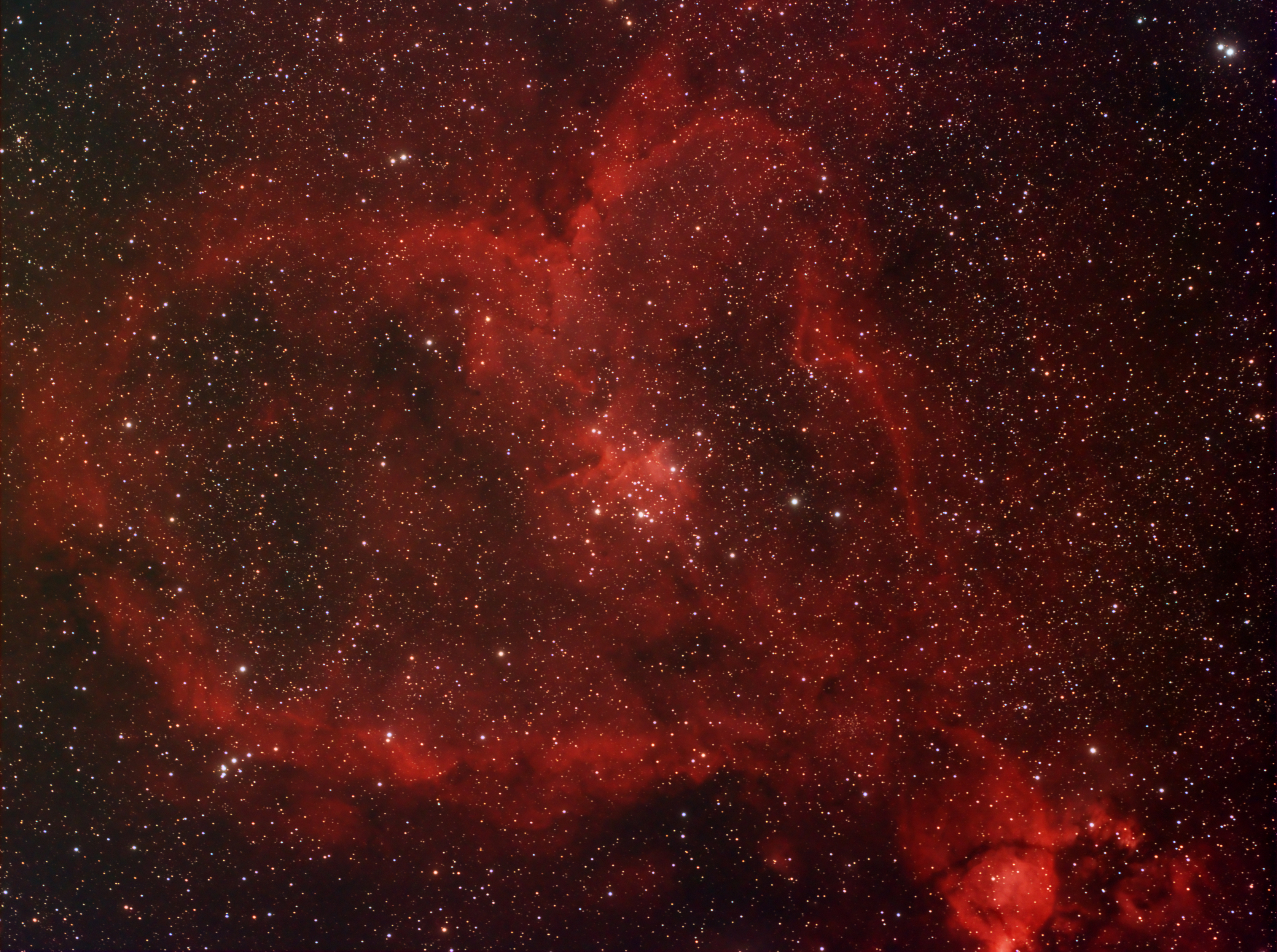 Mit der nomalen Bearbeitung der Farbkamera bekam ich die aufgeblähten Sterne und die Farbgradienten nicht in den Griff. Deshalb Bearbeitung nach der Tonemapping-Methode, Split des RGB-Files in die drei Kanäle, Entfernen der Sterne mit Straton, Stretch der Kanäle und wieder Zusammenfügen als RGB mit PS CS4, Overlay des Original RGB-File mit Screen-Mode zum Erhalten der Sternfarben.