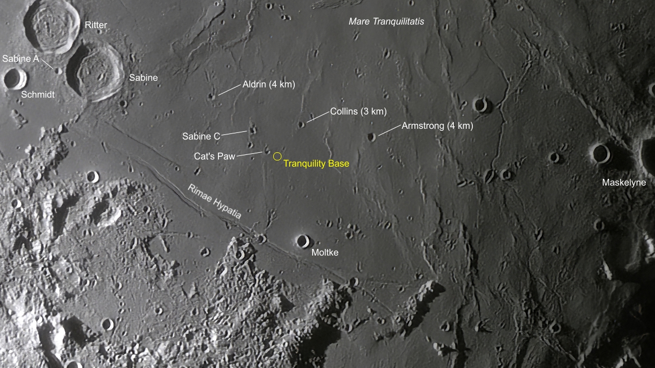Ein kaum beachtetes Jubiläum findet am 22. April 2024 statt: Vor genau 20000 Tagen (am 20. Juli 1969) betrat Neil Amstrong als erster Mensch den Mond. Eigentlich war es nur mein Ziel, die nach den Apollo-11-Astronauten benannten Umgebungskrater Armstrong, Collins und Aldrin einzufangen. Aber ich war überrascht, mit meiner relativ bescheidenen Ausrüstung (C8, 2x Barlow und veLOX178c) auch wesentlich feinere Strukturen wie den nahegelegenen Cat's Paw abbilden zu können. Wichtig für die kontrast- und detailreiche Abbildung der Apollo 11 Landing Site war eine nahe Lage zum Mondterminator. Aufnahme im Lucky Imaging-Verfahren (1% von 10000 Frames zu je 3,65 ms)