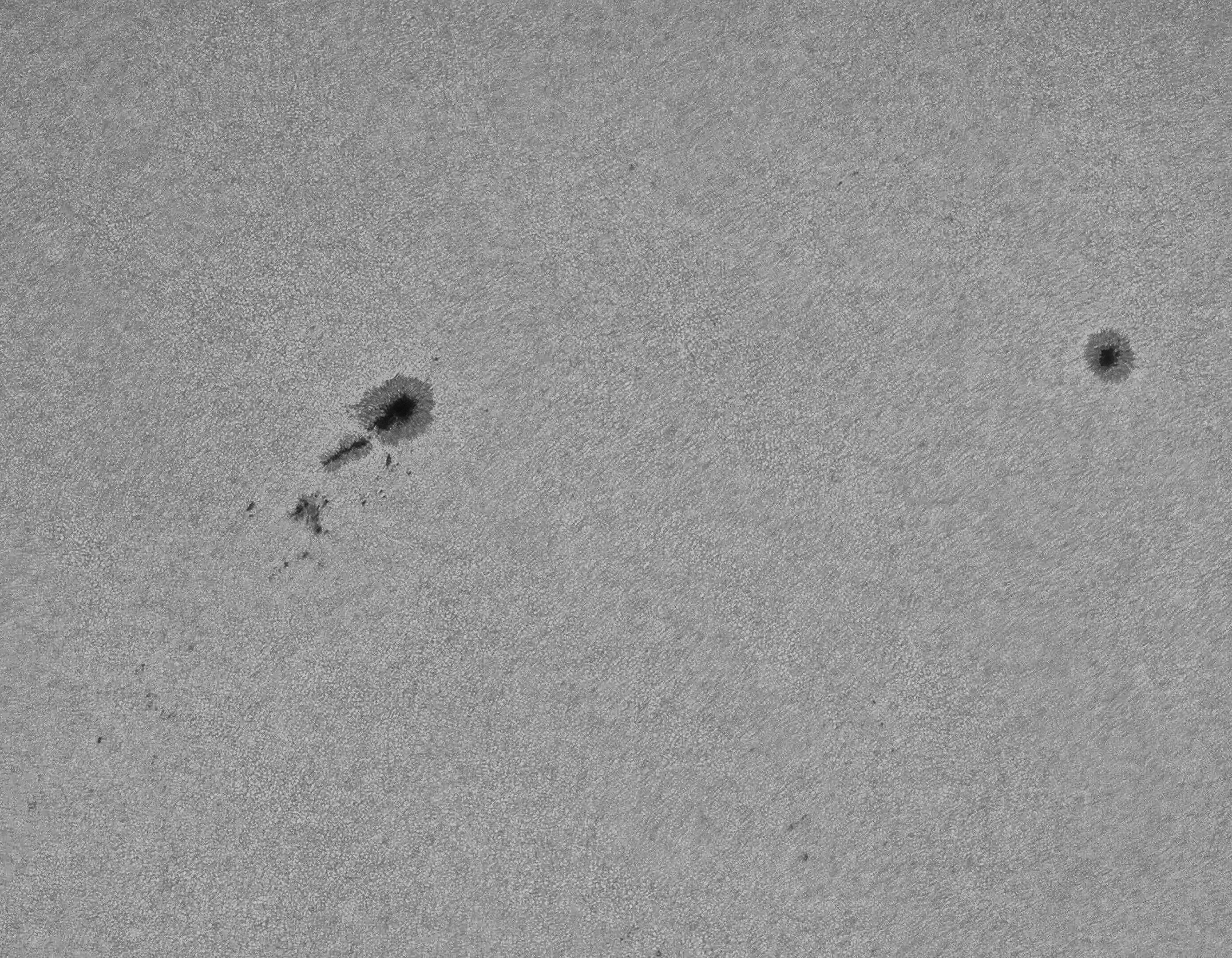 So einen länglichen Teil eines Sonnenflecks sieht man wohl auch nicht alle Tage. Die Umbra lang und an beiden Enden offen, flankiert von einer schmalen Penumbra. Sonst sind Sonnenflecken ja eher rundlich wie der Fleck am rechten Bildrand. Das Foto ist ein bearbeitetes Einzelbild aus einem 4K-Video.