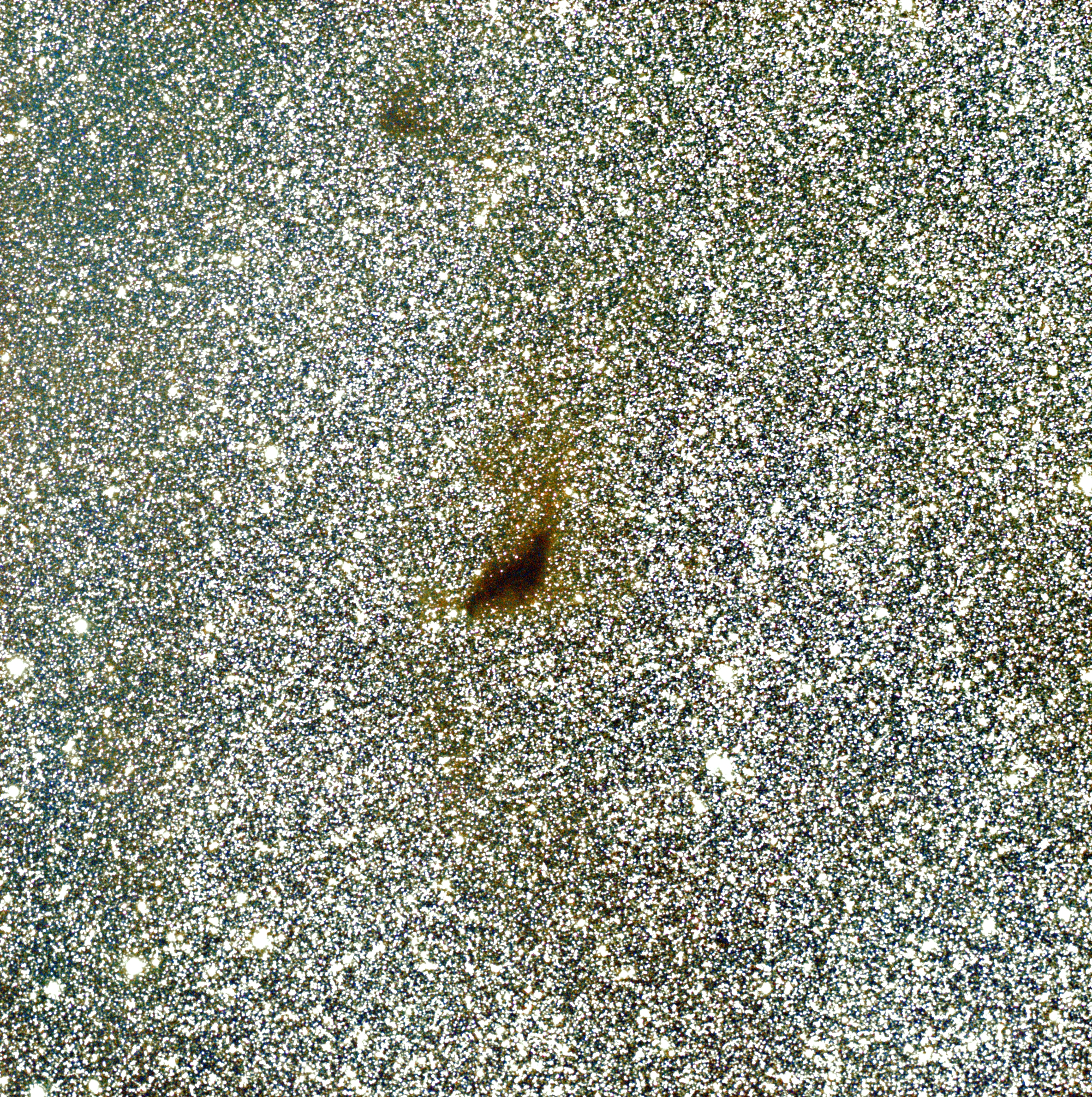 Dies ist die berühmte Dunkelwolke B 133 im Adler! Sie liegt 2 Grad südlich von Lambda Aquilae und 3,8 Grad östlich des bekannten Wildenten-Sternhaufens M11. Obwohl auf der Aufnahme unzählige Milchstraßensterne sichtbar sind, liegt sie doch nur am Ostrand der viel helleren Scutum-Wolke! Wie dunkel eine solche Dunkelwolke ist, lässt sich anhand der sogenannten Opazitätsskala angeben: je höher der Wert (von 1 bis 6) desto weniger Licht lässt die Wolke durch. B133 weist mit einem Wert von 6 die höchste Stufe auf und erscheint dadurch besonders auffällig. Nur Infrarotaufnahmen enthüllen hinter der Wolke liegende Sterne! Dazu liegt sie noch, wie erwähnt, im extrem sternreichen Gebiet der Großen Schildwolke,was den Kontrast noch verstärkt ! Ihre Entfernung wird zu 1300 Lichtjahren geschätzt, was bei der scheinbaren Größe von 18 x 5 Bogenminuten einer linearen Ausdehnung von 2x7 Lichtjahren entspricht. Emerson E. Barnard erstellte 1919 seinen Catalogue of Dark Nebulae, anfänglich mit 182 Objekten, posthum wurde er im Jahr 1927, basierend auf seinen Aufzeichnungen und Aufnahmen auf 349 Stück erweitert.