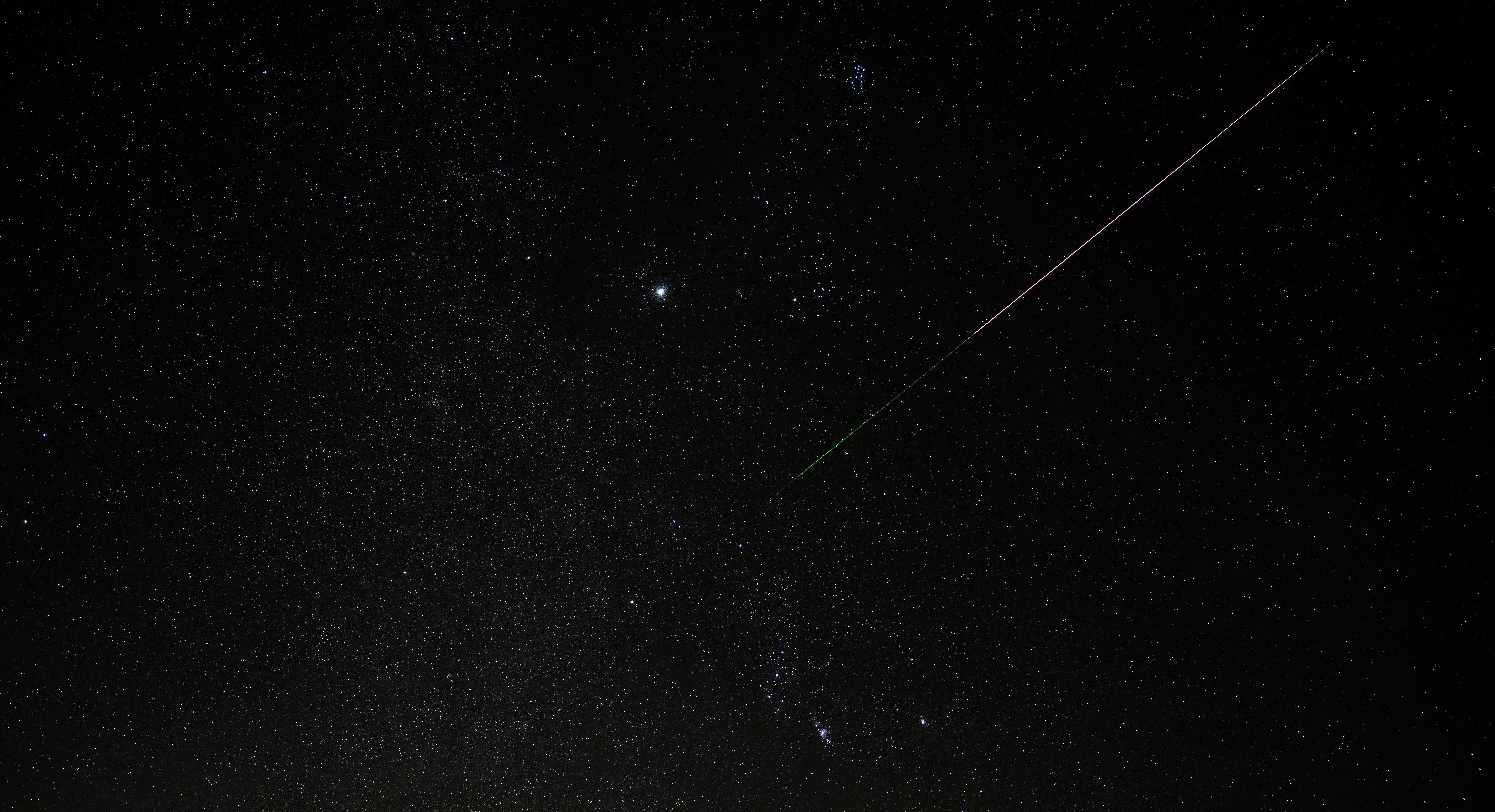 Während einer Serienaufnahme huschte ein Meteor genau am Ende der ersten Aufnahme und danach noch auf das Folgefoto. Auf diesem sieht man sehr schön das Nachleuchten der Spur. Bei Bedarf kann ich auch gerne das erste Foto senden.