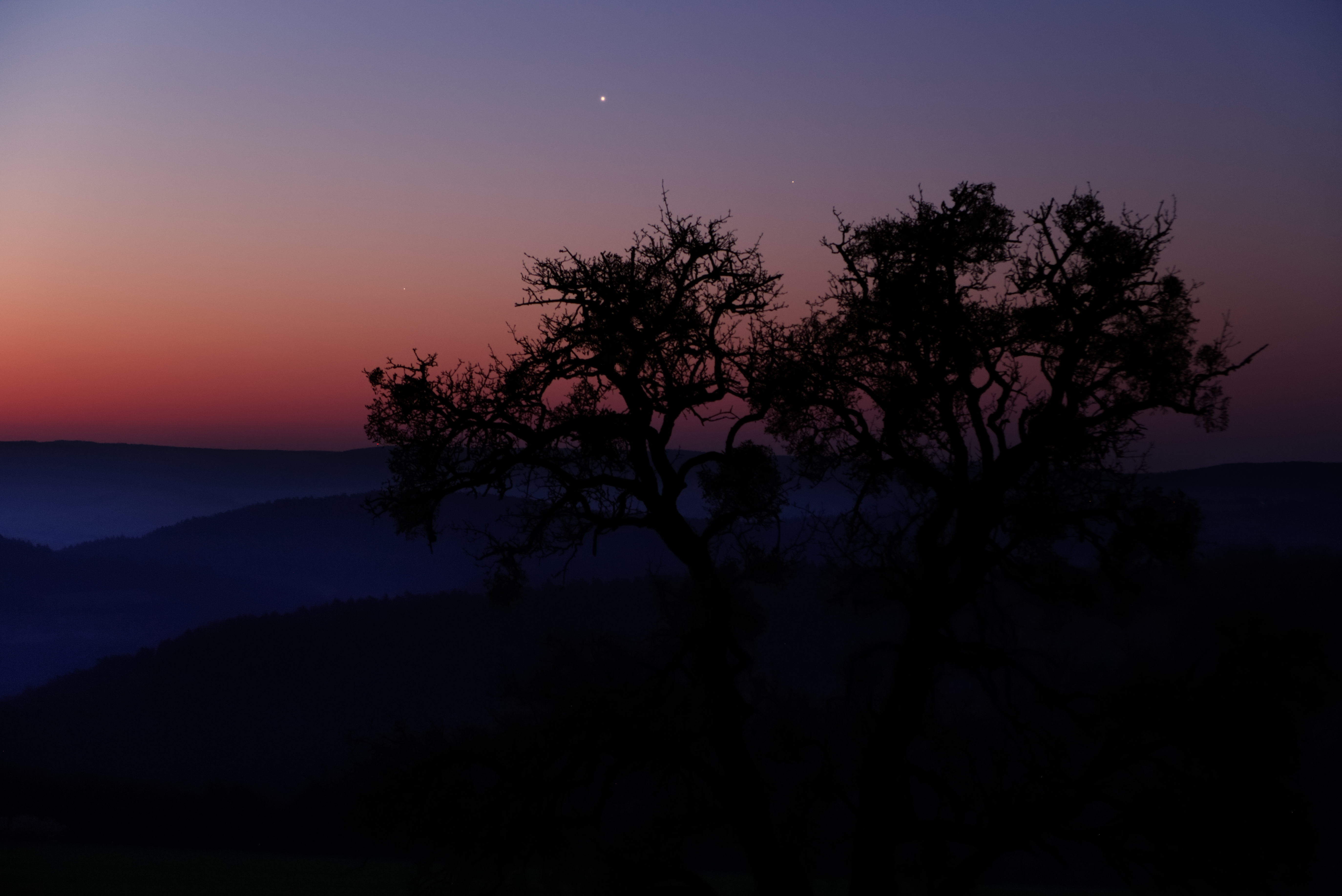 Saturn ist wieder zurück am Morgenhimmel. Langsam und eher unbemerkt nähert sich der Ringplanet dem hell leuchtenden Morgenstern Venus und dem roten Planeten Mars. Um Saturn überhaupt beobachten zu können, bedarf es eines Fernglases oder eben einer Kamera. Visuell ist er zurzeit nur schwer in der Dämmerung zu entdecken. Zum Monatsende bilden die Planeten eine hübsche Dreieckskonstellation im Sternbild Steinbock, die allerdings recht nah am Horizont nicht so leicht zu beobachten ist. Am 28. März gesellt sich die Mondsichel zum Dreigestirn. Hier zeigt sich das Planetendreieck über dem Saartal bei Saarburg. Aufnahmeort ist der 430 Meter hohe Hosteberg im Saargau.