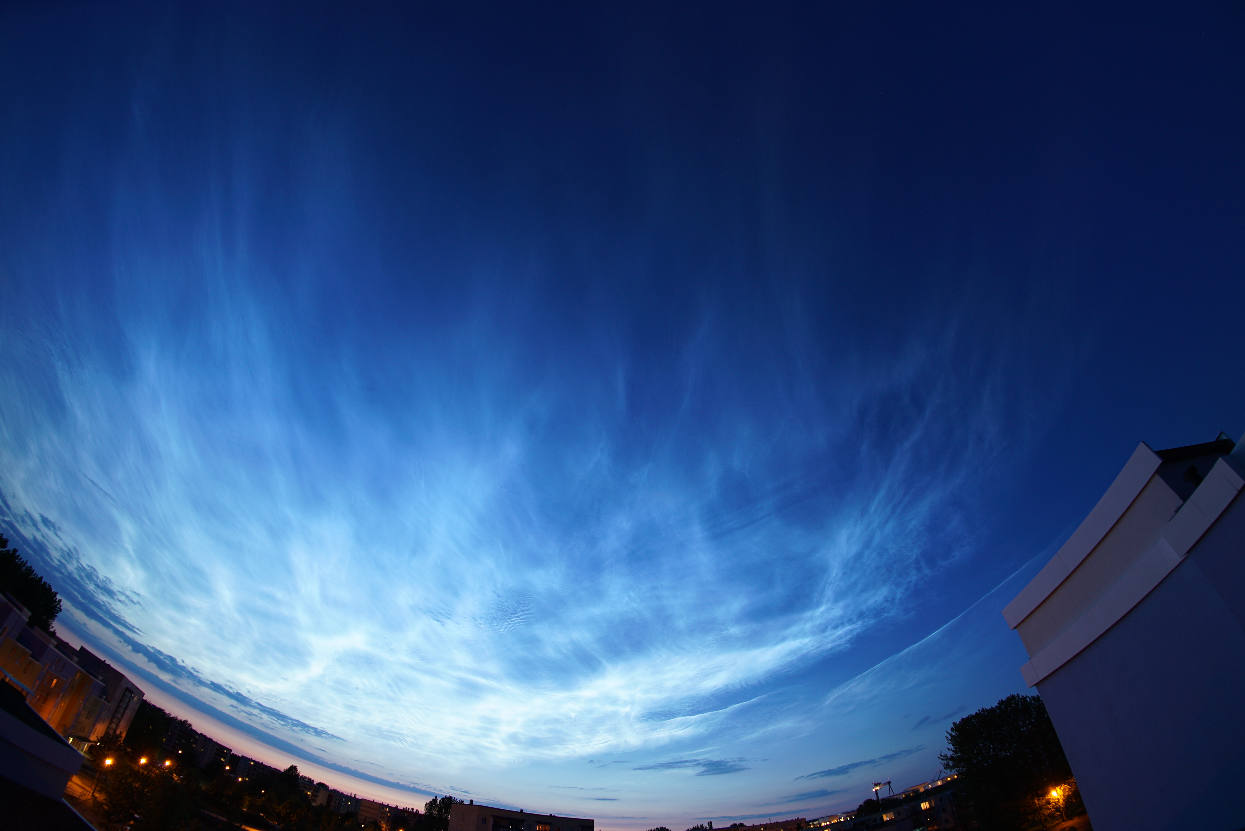 Diese NLC-Nacht wird wohl immer im Gedächtnis bleiben! Nachdem die NLC bereits sehr früh und den kompletten Himmel über Rostock überspannend erschienen, wurden sie im Nordsektor zügig heller und strukturierter. Selbst ein Fisheye-Objektiv reicht nicht aus, um alles abzubilden (hier eine knappe Stunde nach Sichtungsbeginn).