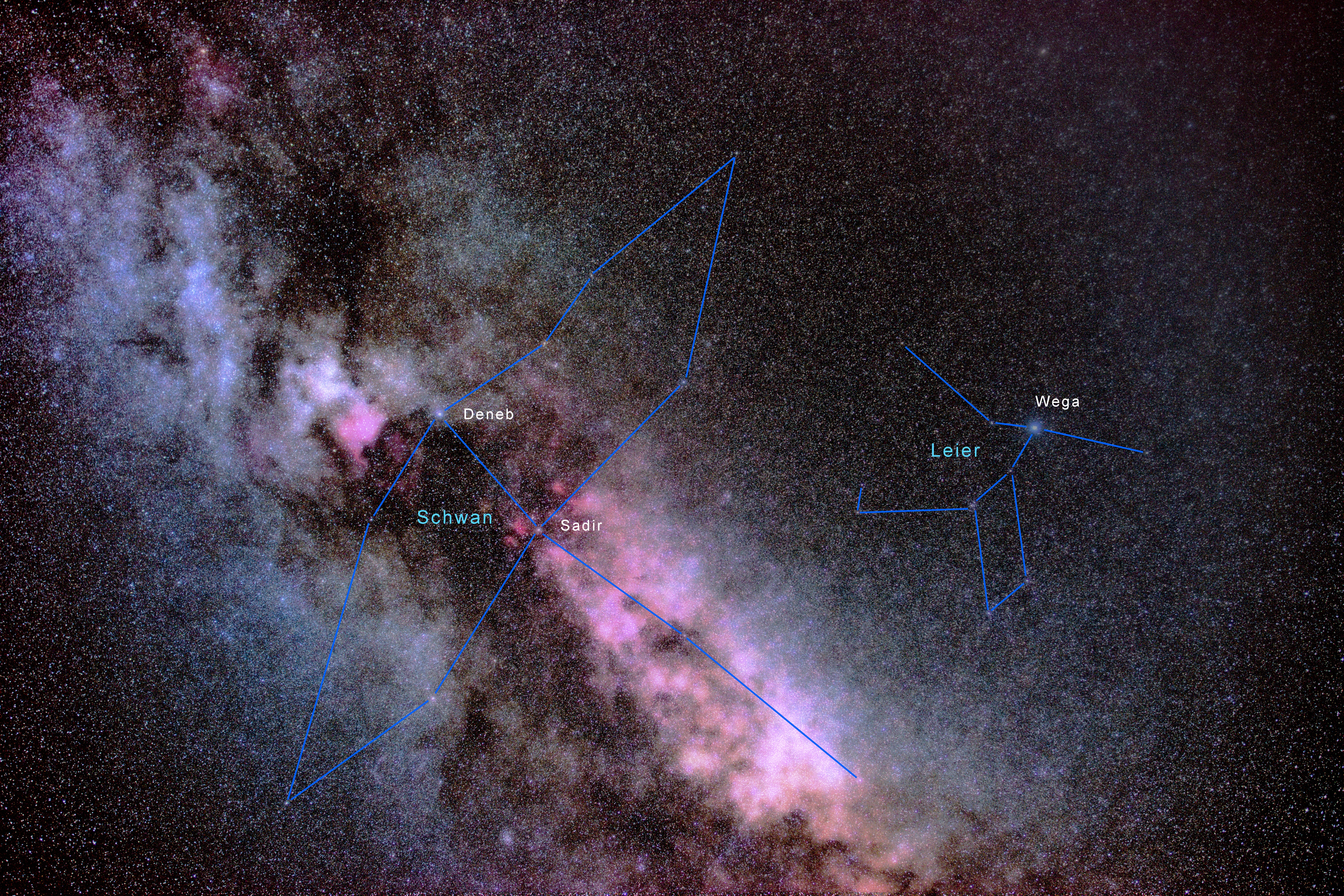 Im Juli streift die Flügelspitze des Sternbilds Schwan den Zenith unseres Himelszelts und mit seinem langgestreckten Hals zieht er mit der Milchstraße seine Bahn. Als »Kreuz des Nordens« ist die Anordnung der Sternenpositionen auch dank seiner hellen Leitsterne Deneb, Sadr und Albireo schnell am Himmel mit bloßem Auge auszumachen. Hingegen braucht es für die Erfassung der Milchstraße in seiner ganzen Leuchtkraft die Langzeitbelichtung eines Astrofotos.