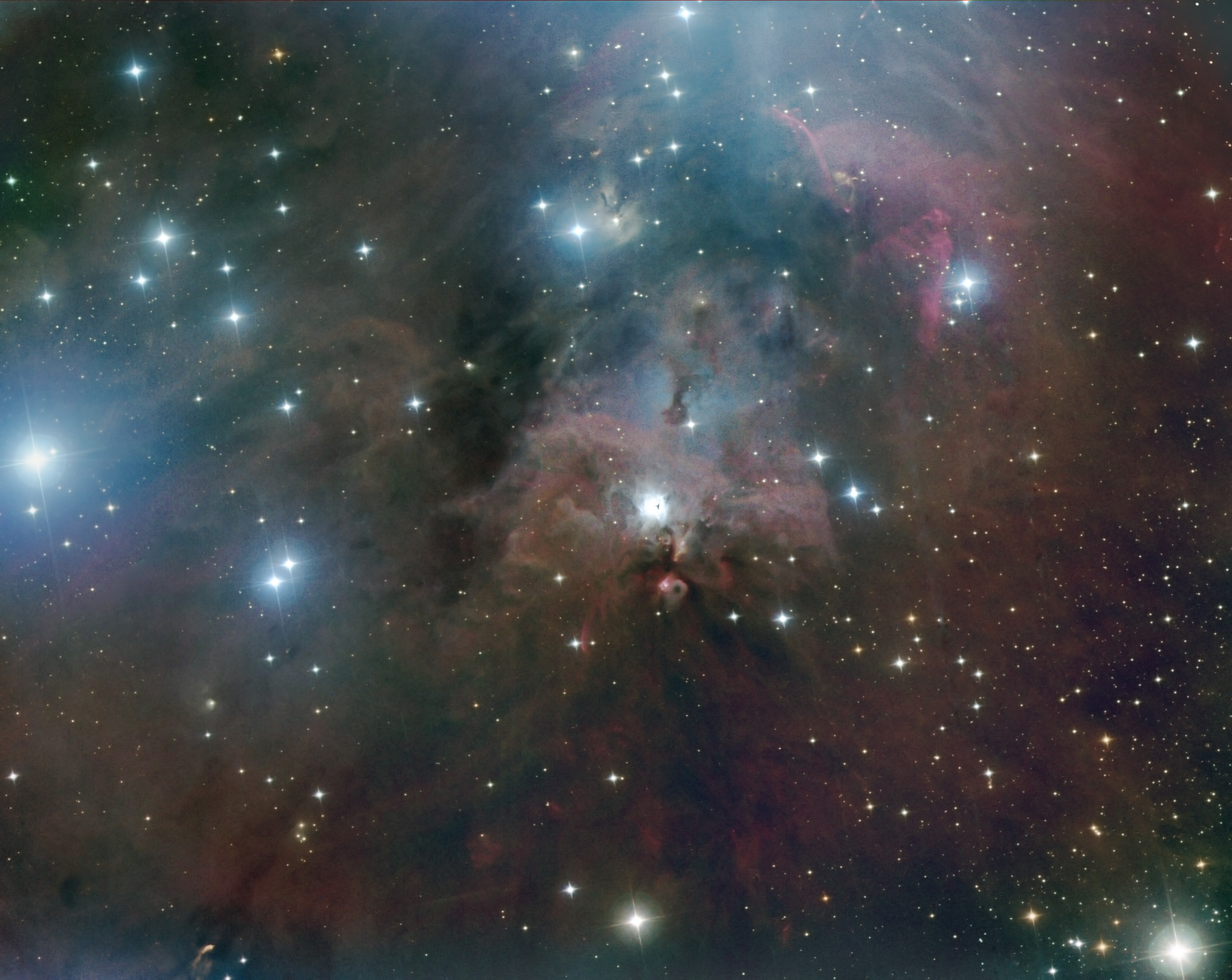 Um die Bildmitte herum erkennt man eine Vielzahl von Reflektions-und Emissionsnebeln, die alle von der intensiven Strahlung junger heißer Sterne erzeugt werden. Einige davon sind sogenannte Herbig-Haro-Objekte, die Sterne in einer ihrer Geburtsphasen darstellen.