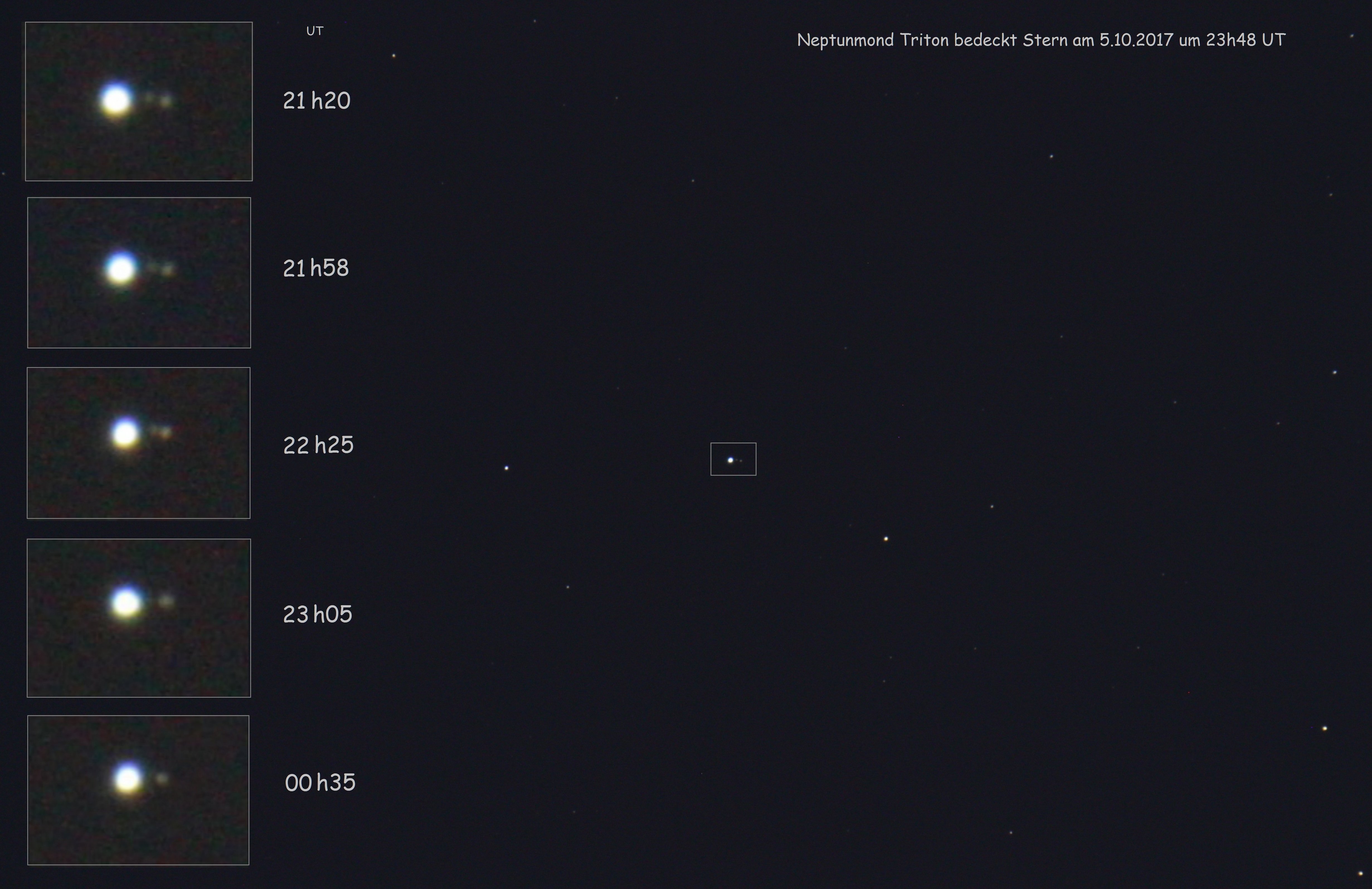 Am 5. Oktober zog der Neptunmond Triton (14,2 mag) an einem Stern mit der Helligkeit von 12,6 mag vorbei und sollte ihn um 23h48 UT für etwa 160 Sekunden bedecken. Ab 21 Uhr UT hatte ich klare Sicht – leider aufsteigender Vollmond - und konnte die drei Gesellen orten. Alle drei Minuten schoss ich ein Bild, was sich als viel zu oft herausstellte … kaum ein Unterschied zu bemerken. Für die Bildkomposition wählte ich die vier besten Bilder aus da die Luftunruhe ziemlich heftig war. Nun geschah auch noch was geschehen musste … um 23:35, also 13 Minuten vor dem eigentlichen Ereigniss stand mein Teleskop nur noch Millimeter vor dem Rahmen meines Dachfensters ((Speichersternwarte ) Schnell machte ich noch drei aufeinander folgende Aufnahmen welche ich zum Bild von 00:35 zusammensetzte. Ich schätze um 00:48 Uhr hätte es nicht viel anders ausgesehen. Halbwegs zufrieden aber wieder mal ein bißchen gescheiter geworden.