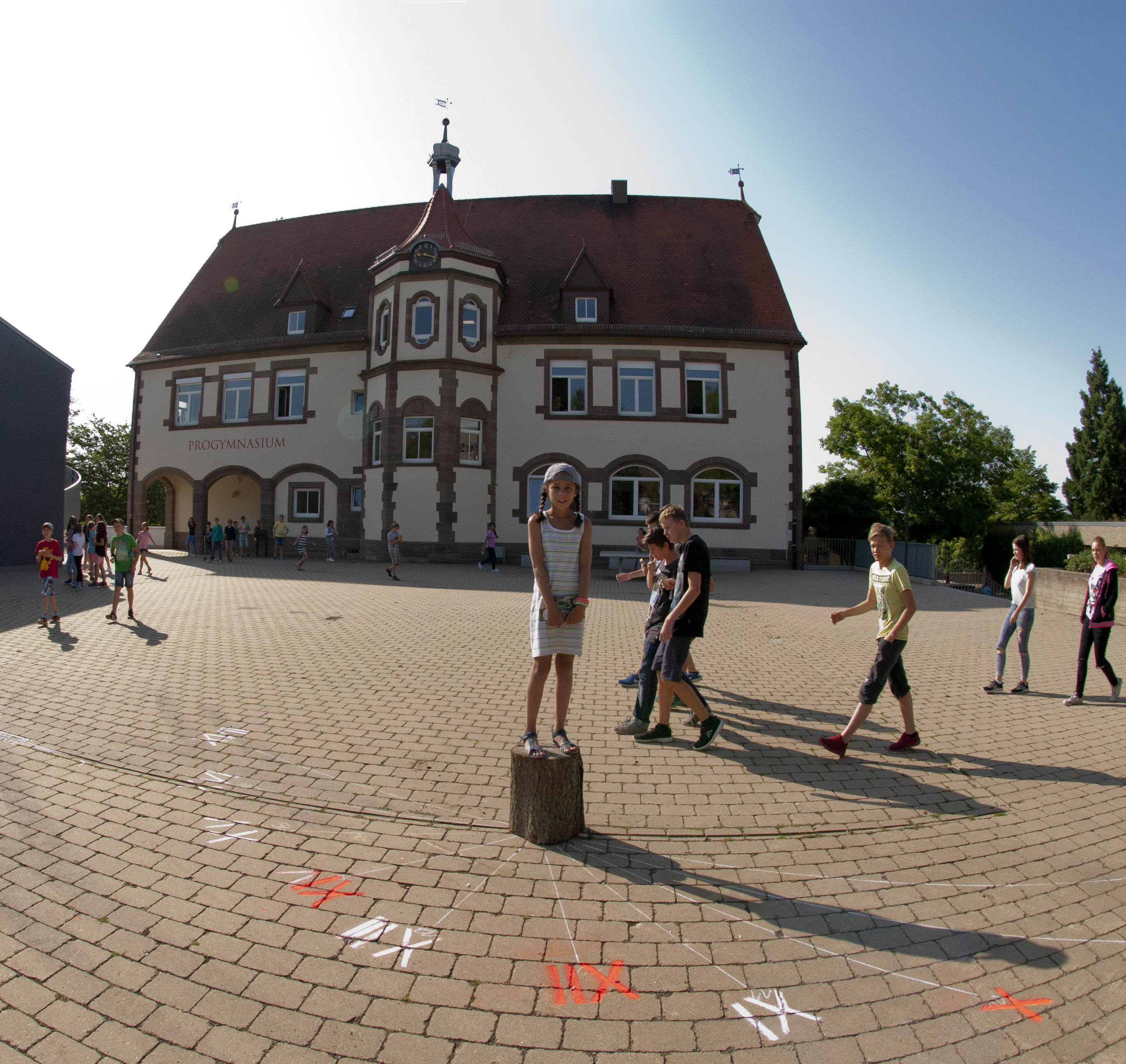 Als Projekt der Astronomie-AG des Progymnasiums Rosenfeld wurde am 19. Juli 2017 eine lebende Sonnenuhr realisiert und im Zeitraffer gefilmt. Jeder sollte für 10 min Gnomon einer Sonnenuhr sein. Alle 20 Sekunden wurde ein Foto aufgenommen und somit der Tag von 8 bis 16 Uhr zugebracht. Fast 40 Personen haben in dem Video mitgespielt, vielen Dank für die aufgebrachte Geduld! Es hat Spaß gemacht und ist in der Planung, Durchführung und dem Ergebnis sehr lehrreich. Es soll eine Wiederholung im Winter geben, um den Unterschied in Sonnenhöhe und Tagesdauer deutlich zu machen. Man achte im Video auch auf die Turmuhr zum Vergleich.
