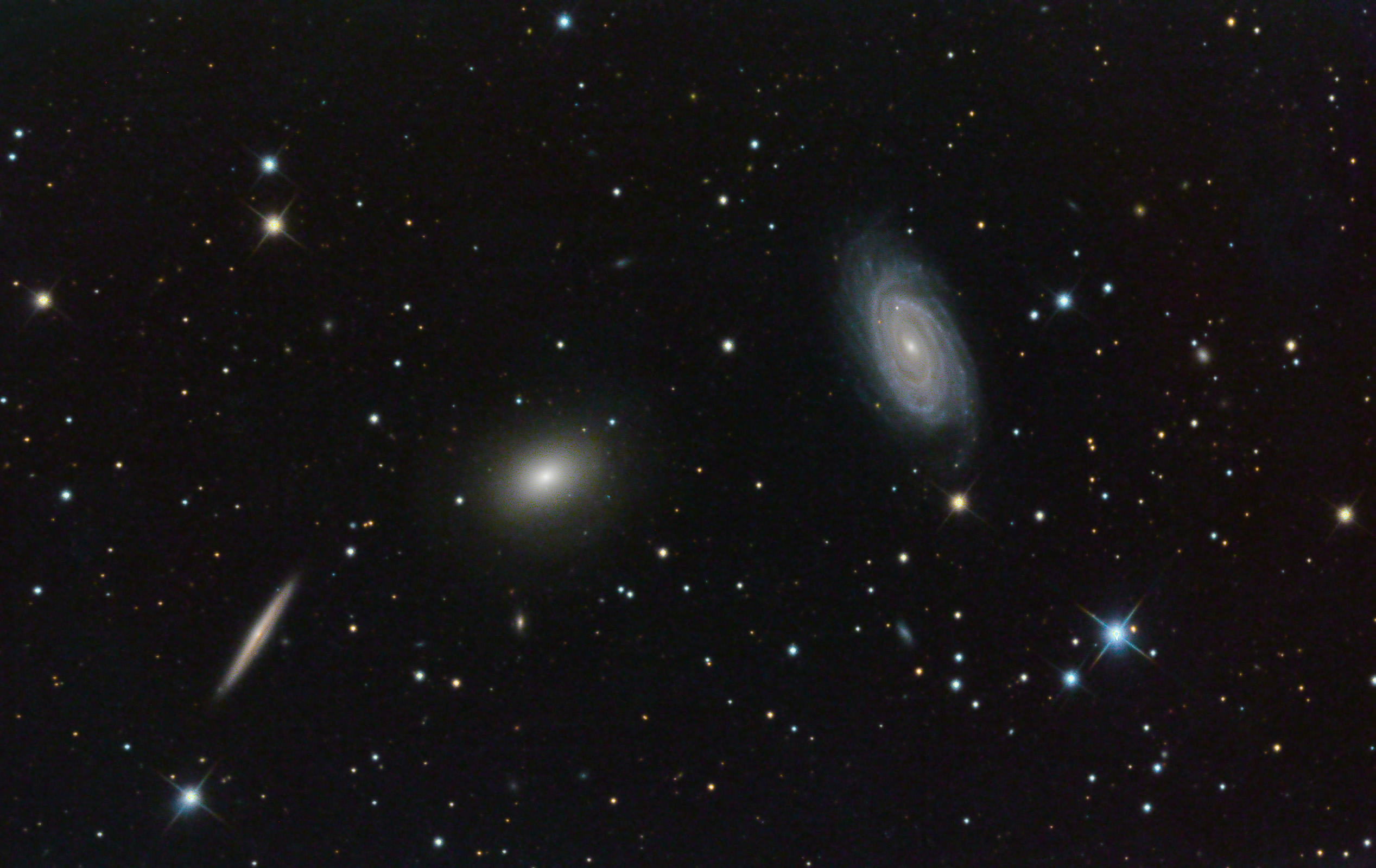Am ersten Blick scheint es wie eine Fotomontage, um unterschiedliche Galaxientypen zu zeigen. Doch es gibt dieses Trio wirklich im Sternbild Drache. NGC5981, NGC5982 und NGC5985 sind hier in einer Linie aufgefädelt und natürlich gibt es jede Menge Hintergrundgalaxien. Zwischen Mai und August 2021 konnte ich für dieses Bild 11 Stunden Photonen sammeln.