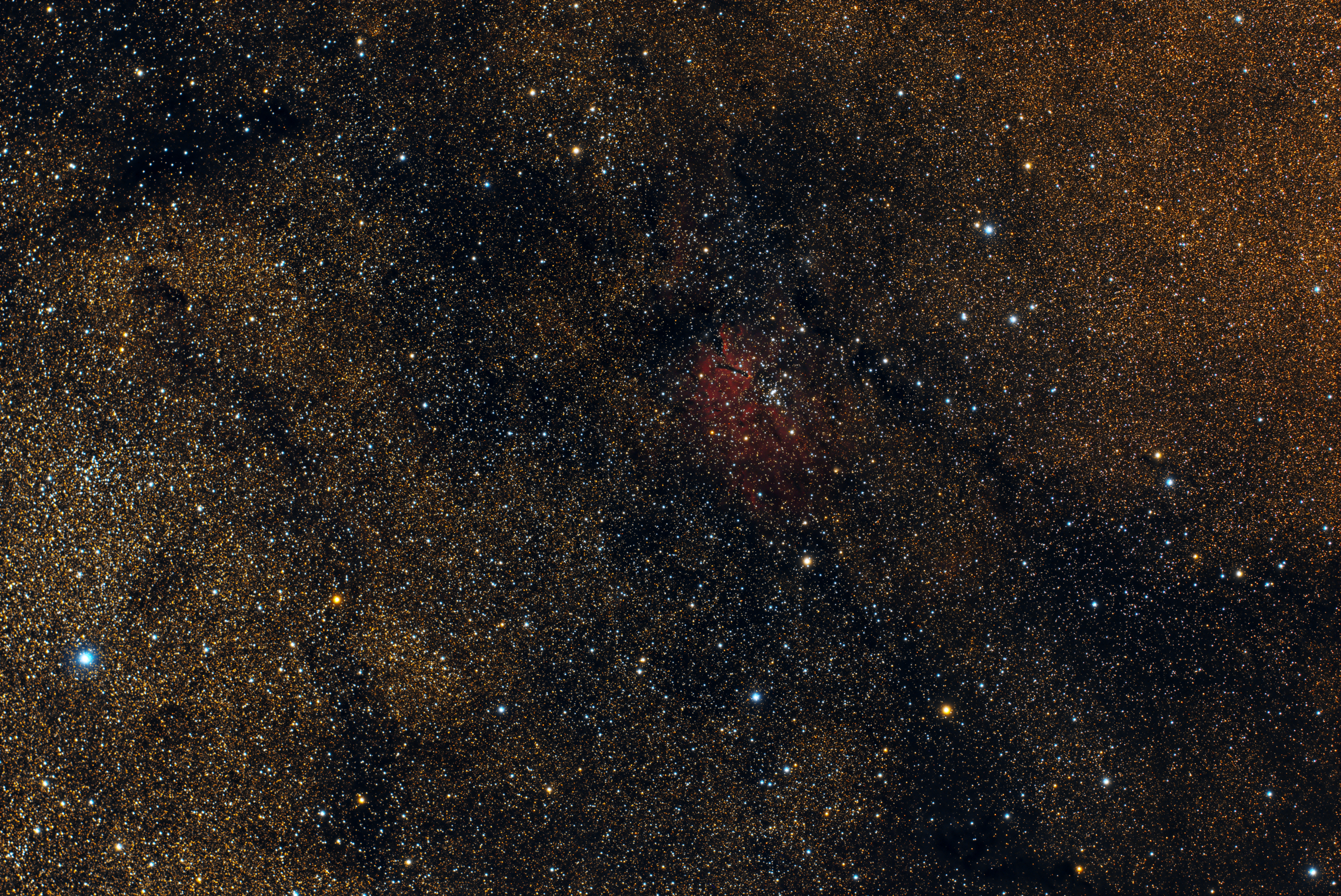 NGC 6820 / 6823 ist ein junger offener Sternhauven im Füchschen unweit des Hantelnebels. Er ist etwa 50 Lichtjahre groß, fällt aber in 6000 Lichtjahren Entfernung von uns kaum weiter auf. Er ist in eine HII-Region eingebettet und leuchtet daher leicht rötlich vor den dunklen Nebeln in der Milchstraße.