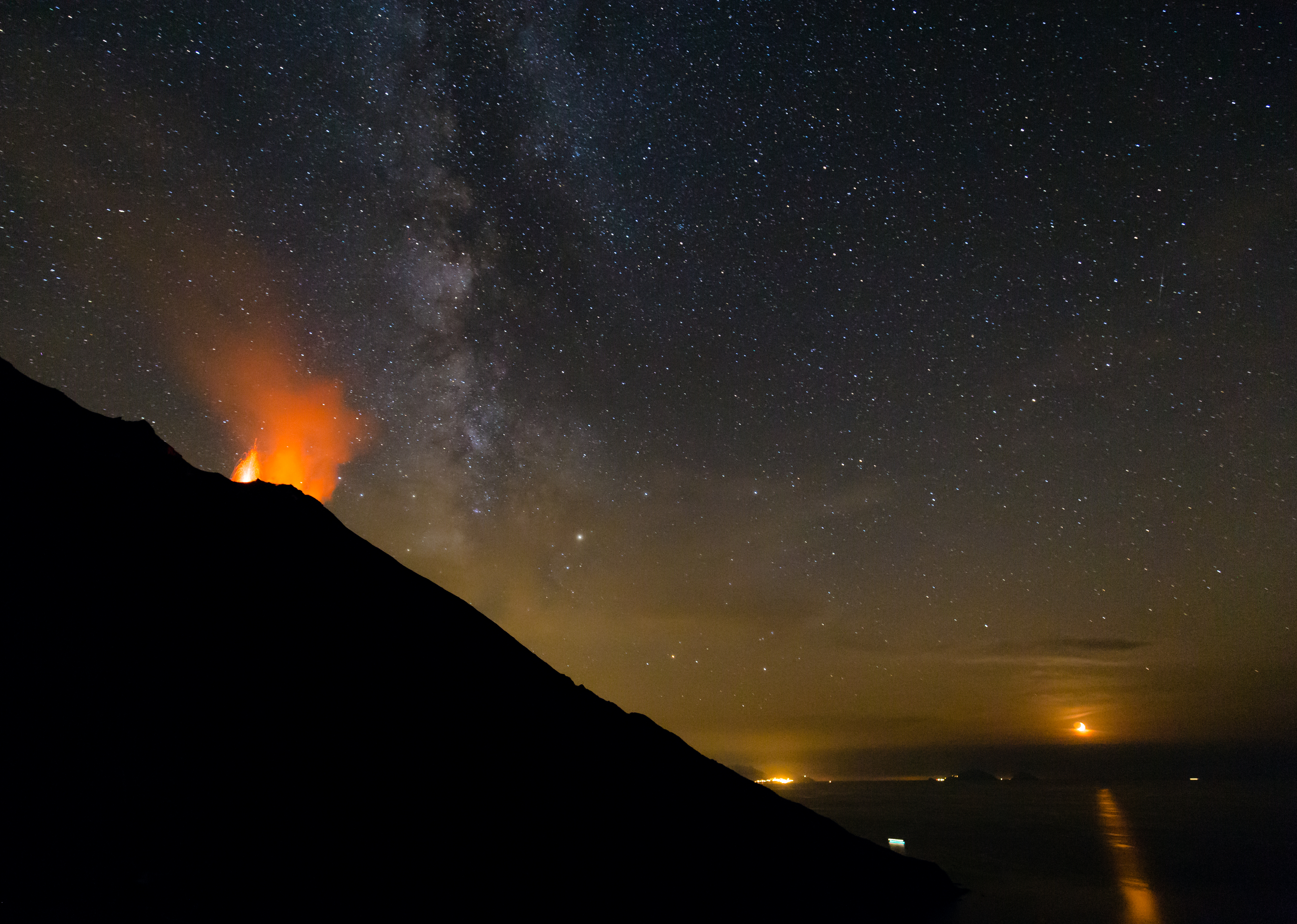 Eigentlich besuchten wir die Insel wegen des Vulkans. Erst vor Ort merkte ich, wie dunkel es nachts auf Stromboli ist. So hatten wir die einzigartige Möglichkeit, Lavafontänen und einen fantastischen Sternenhimmel gleichzeitig zu genießen.