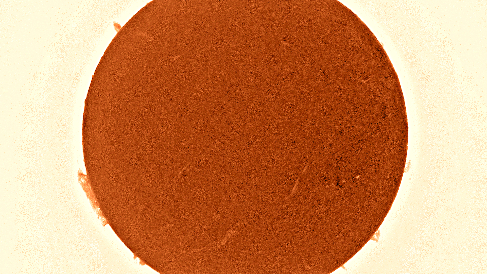 Neben ein paar kleinen Sonnenflecken, Filamenten und Protuberanzen ist eine beeindruckende Protuberanz mit beachtlicher Ausdehnung zu sehen.