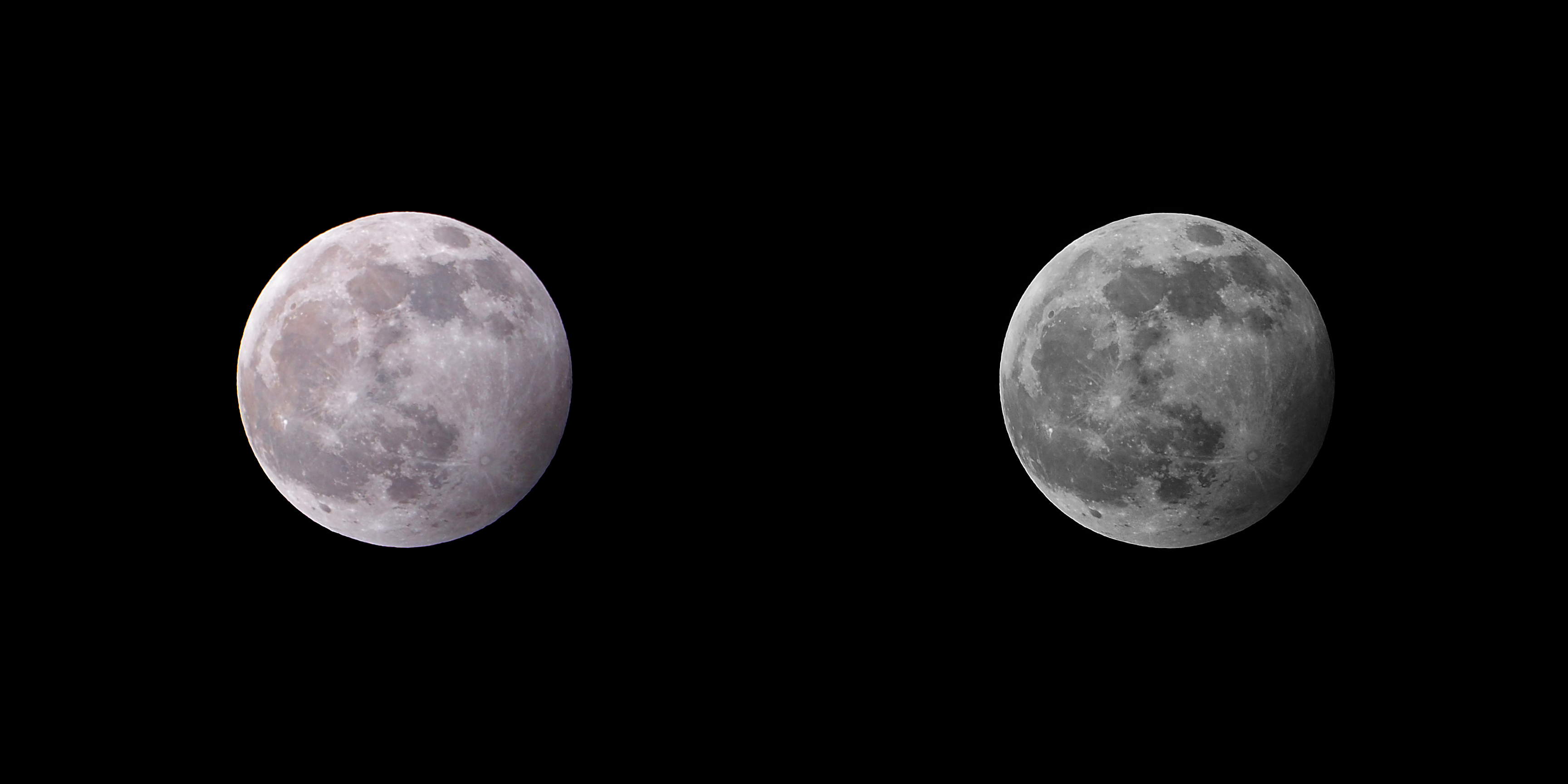 Da ich während der kleinen Mondfinsternis verreist war, kam leider nur die kleine Ausrüstung ins Gepäck: ein 75-300-mm-Telezoom mit Kamera und ein Stativ. Aber auch damit lässt sich eine Mond-Halbschattenfinsternis darstellen, hier einmal in Farbe und als kontrastreicheres Schwarz-Weiß Bild. Beide Fotos entstanden gegen 20:40 Uhr, also etwa eine halbe Stunde nach dem Maximum. Vorher war es leider bewölkt.