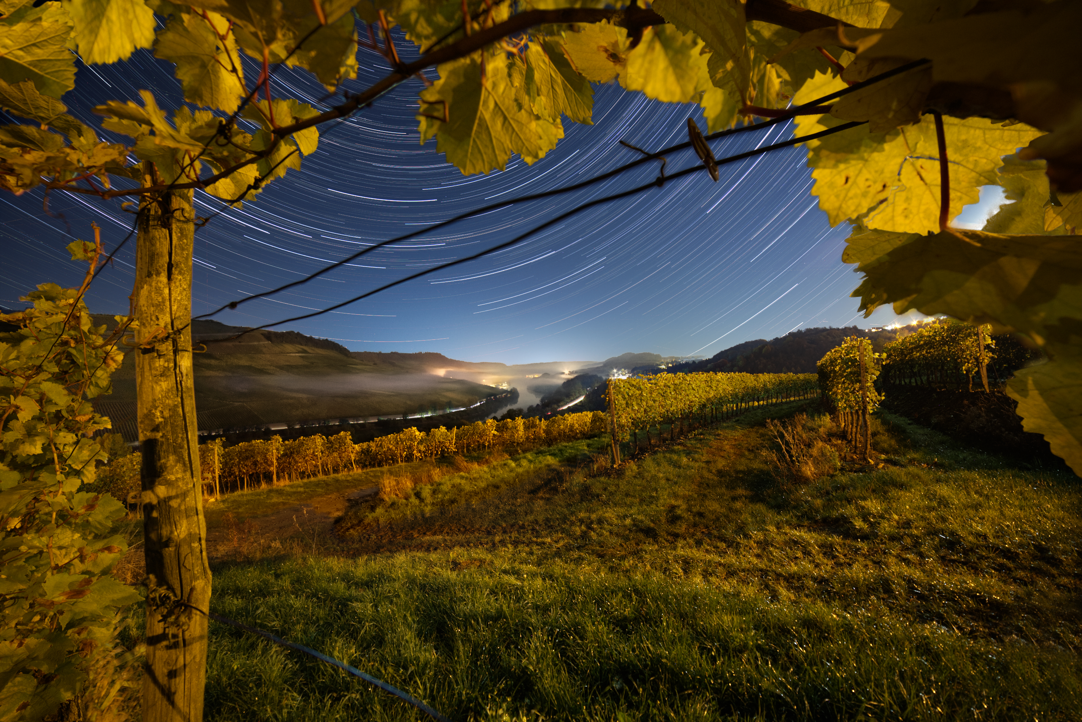 Die Obermosel gehört zweifelslos zu den reizvollsten Landschaften in Rheinland-Pfalz und dem Großherzogtum Luxemburg. Gerade im Herbst zeigen sich die mit Elbling-, Burgunder-, Auxerrois- und Chardonnay Rebstöcken kultivierten Hänge in besonderer Schönheit. Anfang November ist die Weinlese in den Wingerten abgeschlossen und die Weinblätter färben sich in fantastischem Gelb. Eine wahre Farbenexplosion für das Auge! Das Bild zeigt das Obermoseltal zwischen den Gemeinden Wormeldange auf Luxemburger Seite und dem rheinland-pfälzischem Nittel. Standpunkt der Kamera ist ein Weinberg unterhalb von Wincheringen mit Blickrichtung Norden. Auf dieser Aufnahme ziehen die Sterne kreisrunde Bahnen am Firmament. Der von einem Weinblatt verdeckte Mond scheint von der oberen rechten Bildhälfte ist Tal. Die Mosel fließt ruhig in ihrem Bett, während sich über ihr erste Nebelfelder bilden. Dabei wird der Vordergrund von einer nahegelegenen Laterne einigermaßen dezent angeleuchtet. Das Bild ist ein so genanntes `Focusstacking`. Separat fokussierte Vordergrundaufnahmen wurde hier mit einer auf den Sternenhimmel fokussierten Aufnahme kombiniert.