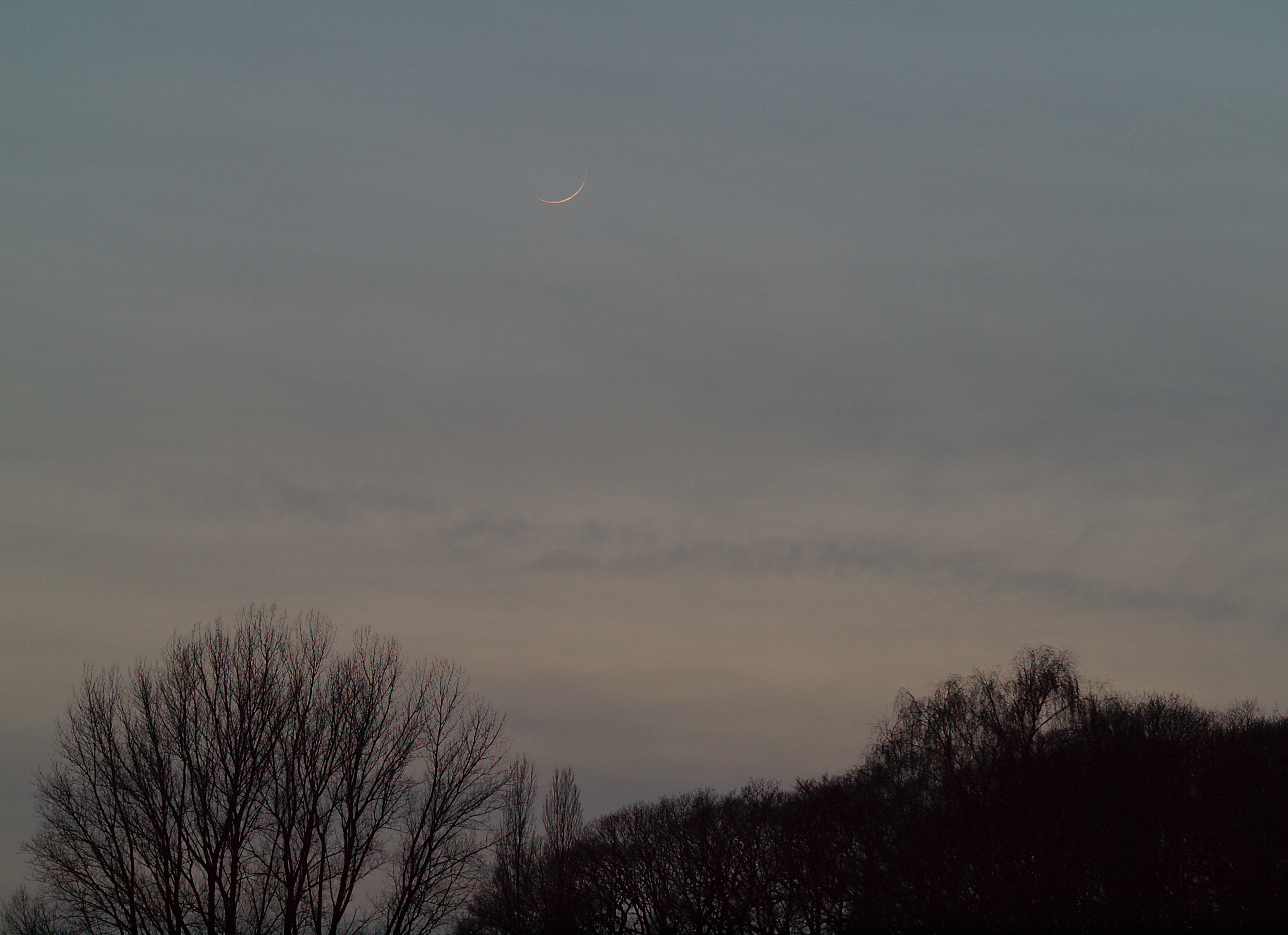 Diese Mondsichel ist knapp 34 Stunden alt. Für diese Aufnahme habe ich mir einen freien Platz in der Nähe des Kemnader Sees gesucht, einem beliebten Ausflugsziel im Ruhrgebiet. Auch vorbeikommende Spaziergänger interessierten sich dafür, was ich da am Himmel suche (da war es noch nicht so dunkel und die Mondsichel noch schwer zu finden...). So entwickelte sich ein interessantes Astronomiegespräch. Später konnte ich dann einige Aufnahmen auf dem Display zeigen.