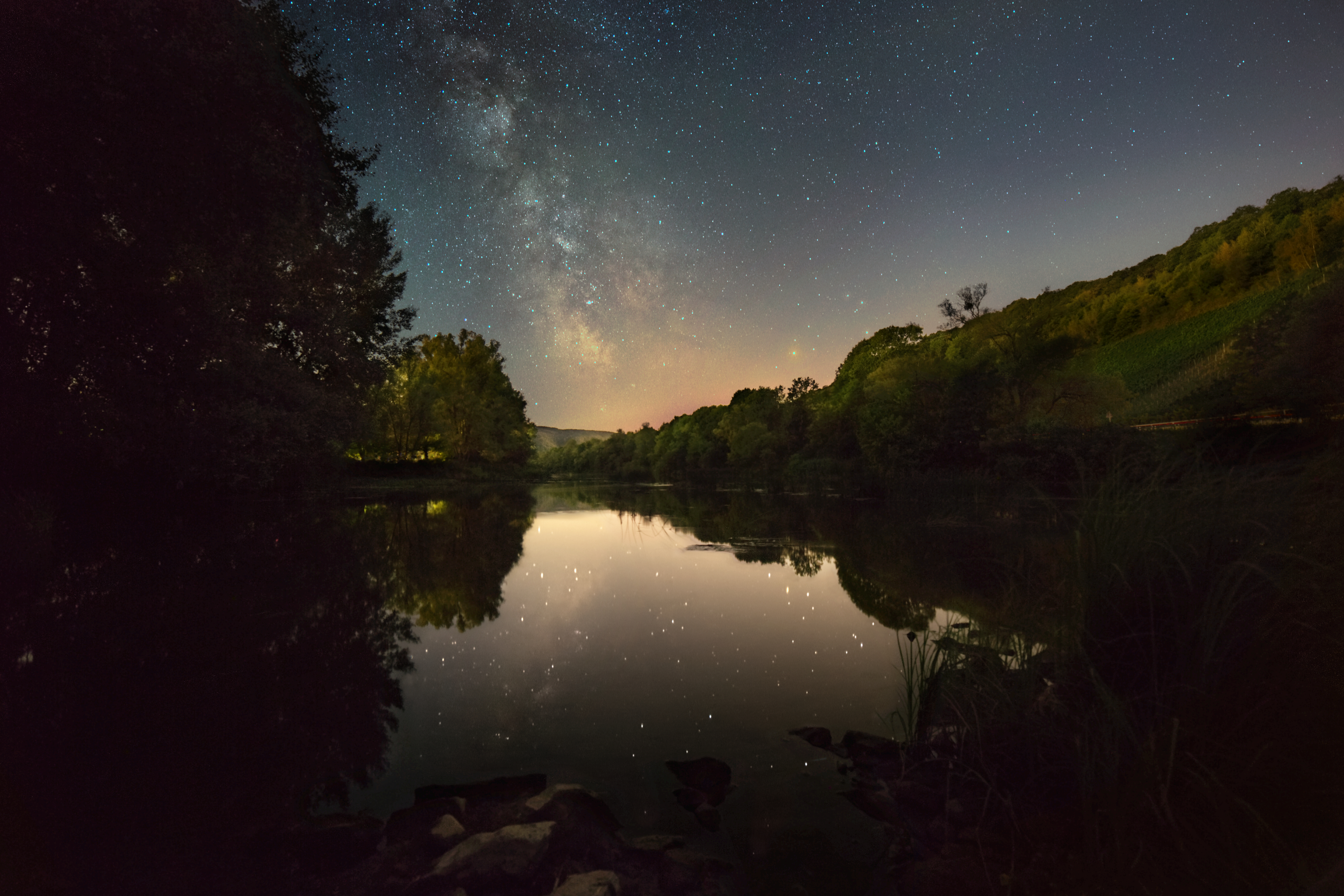 Er ist 8 km lang, wild, urig, rauschend, seine Ufer sind zu meist unzugänglich. Vor Allem aber ist er ein Glücksfall für Flora und Fauna. Das Naturschutzgebiet Wiltinger Saarbogen im Naturpark Saar-Hunsrück verläuft von Schoden über Wiltingen, Kanzem und Filzen, meist begleitet von steilen Weinbergen. Der Naturliebhaber findet hier weite Flussauen mit urigen Weiden und knochigen Eschen sowie meterhohen Schilf und Röhricht. Seerosenfelder gedeihen im ruhigen Flachwasser. Stillwasserzonen wechseln sich ab mit fischreichem, sprudelnden Stromschnellen. Viele Tiere leben in und am Wasser. Hier lassen sich Kormorane, Fischreiher und Eisvögel beobachten. Und mit etwas Glück läuft einem ein Biber über den weg. Und tatsächlich hatte der Fotograf in dieser Nacht dieses Vergnügen. Eine weitere Besonderheit dieses Flussabschnitts sind die letzten Buhnenfelder der Saar. Von einem dieser Buhnendämme entstand auch dieses Bild des Sommersternenhimmels. Mitten im Fluss! Extremes Niedrigwasser machte diesen Standort überhaupt erst möglich. Es spannte sich in dieser Nacht ein außergewöhnlich klarer Sternenhimmel über das Saartal. Klar und deutlich zeichnete sich das Band der Milchstraße ab. Leicht zu erkennen waren die südlichen Sternbilder Skorpion und Schütze. Eine Nacht von Abend- bis zur Morgendämmerung inmitten der Natur. Und das bei einer tiefsten Lufttemperatur von 22°C nach Mitternacht.