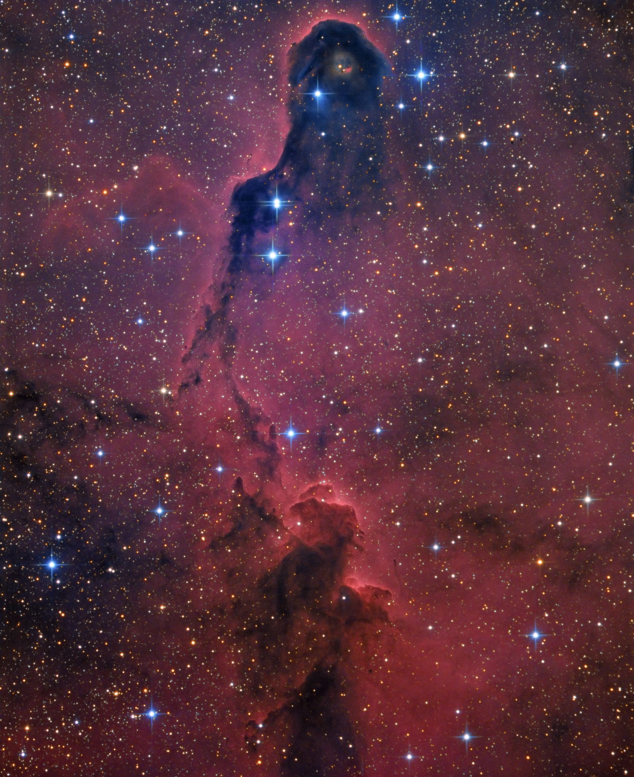 Ein faszinierender Gasnebel im Sternbild Kepheus. Die Dunkelstrukturen erinnern an das Haupt eines Elefanten sowie dessen Rüssel. Umgeben sind diese von angeregtem Wasserstoff, welcher in charakteristischem H-Alpha Rot leuchtet (Balmer Serie).