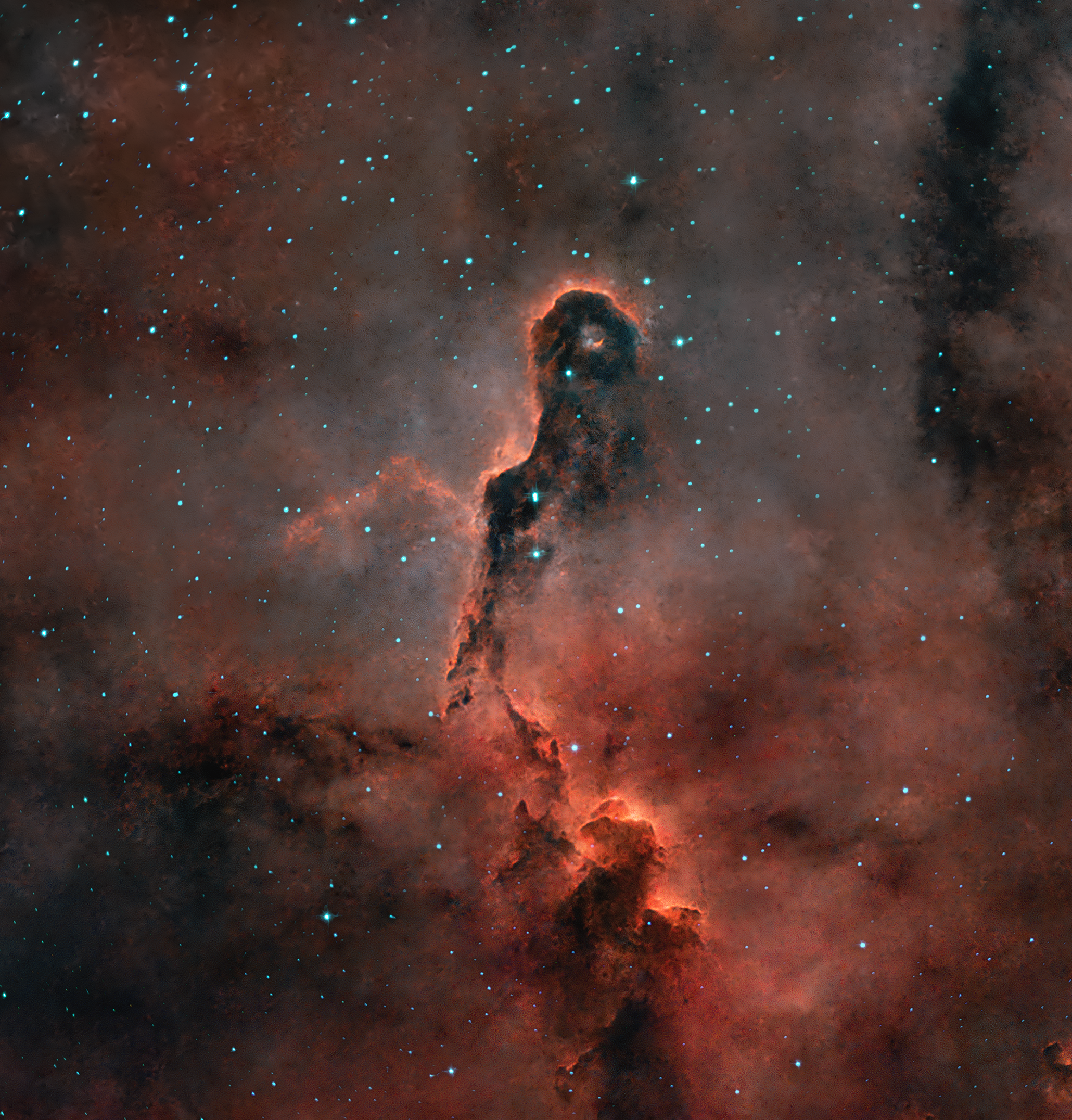 Der Elefantenrüsselnebel ist eine dichte Säule aus Gas und Staub aus der Sternentstehungsregion IC 1396. Dunkle Wolken enthalten das Material für die Entstehung neuer Sterne. Die kosmische Säule, auch als vdB 142 bekannt, erhebt sich über 20 Lichtjahre, während der Komplex IC 1396 und sein zugehöriger junger Sternhaufen, etwa 3.000 Lichtjahre entfernt, einen großen Bereich des Himmels im Sternbild Kepheus abdecken.