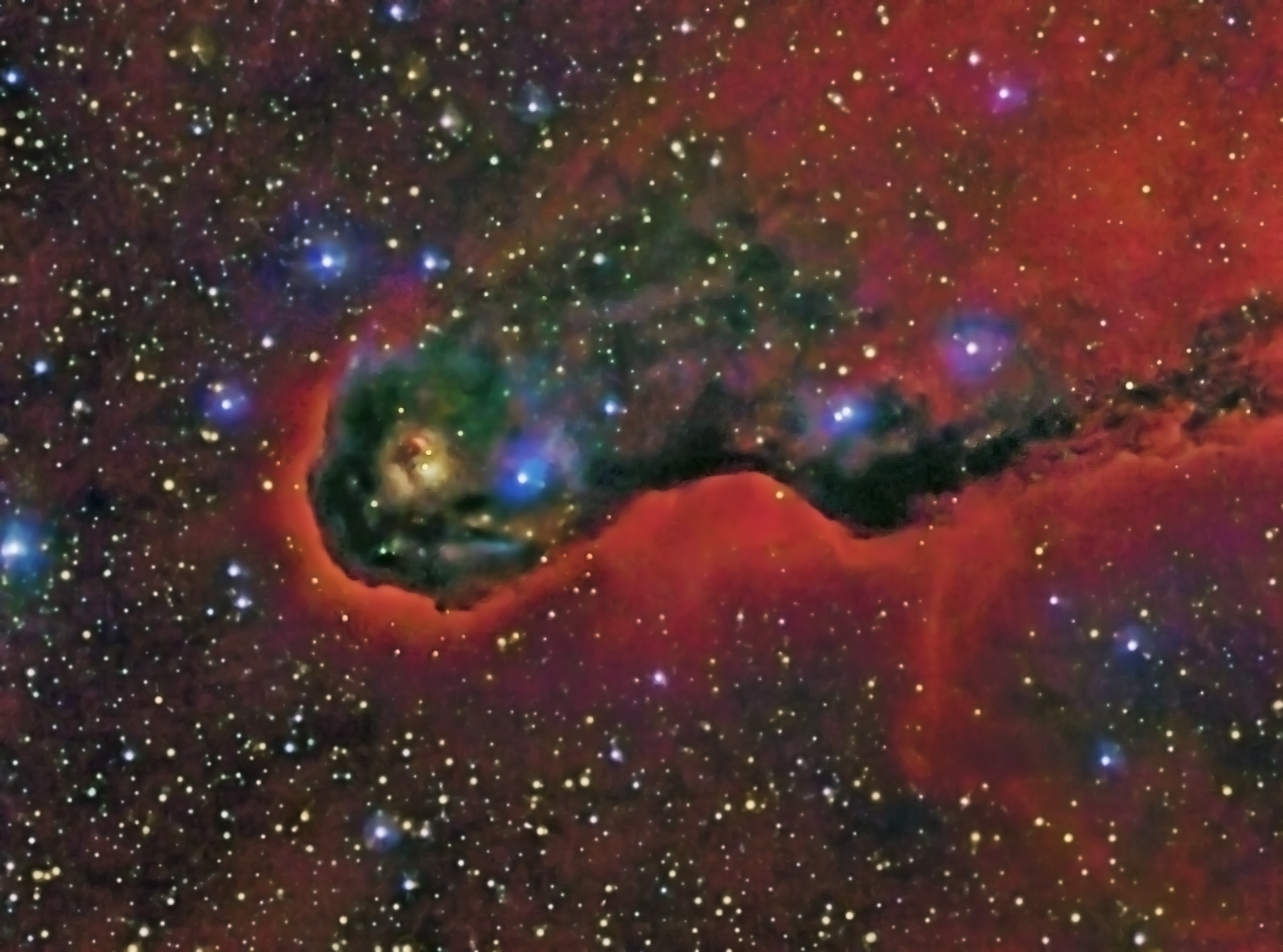 Der Elefantenrüsselnebel ist auch unter der Katalogbezeichnung IC 1396A bekannt. Diesmal habe ich das Gebiet mit einer größeren Brennweite aufgenommen und neben den RGB-Filtern noch ein H-alpha-Filter eingesetzt. Eine klare Nacht vor einer Schlechtwetterperiode ermöglichte diese Aufnahme bei uns in Norddeutschland.