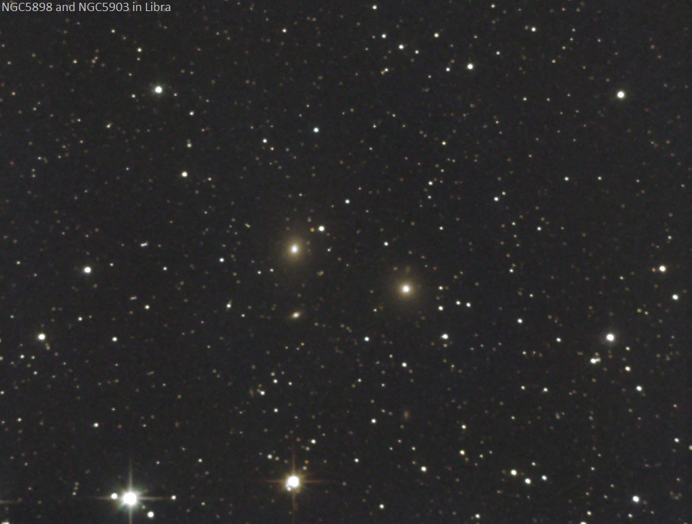 Tief in der Waage bei -24 Grad Deklination liegen nur 5,5 Bogenminuten voneinander entfernt, die gleichhellen (11,2 mag, 11,4 mag) elliptischen Galaxien NGC 5898 (E0) und NGC 5903 (E2) in einer Entfernung von 90 Millionen Lichtjahren. Aufgrund der kurzen Sommernacht verwendete ich ausnahmslos 2x2 gebinnte Frames für das LRGB-Bild.