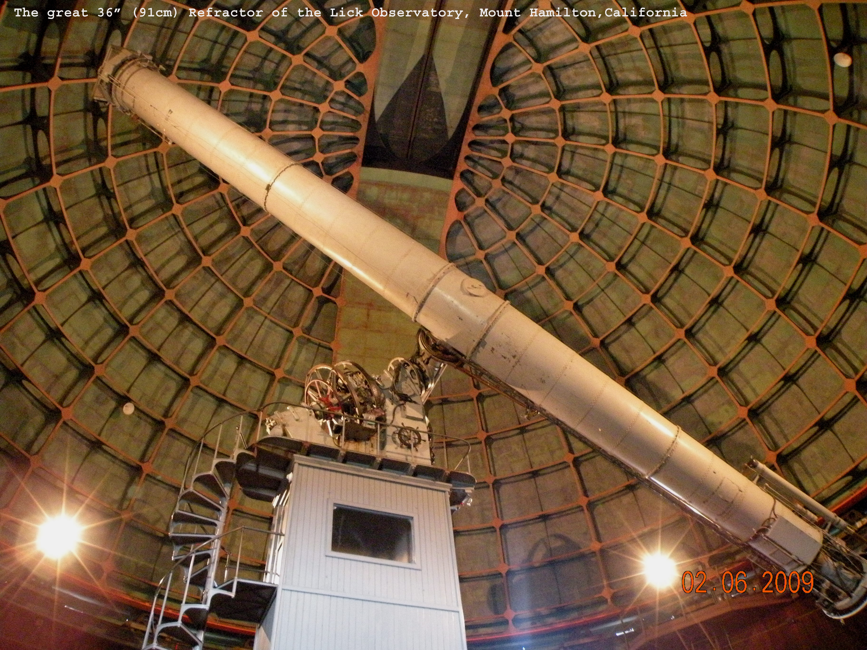 Dies ist der große Refraktor des Lick-Observatoriums auf dem Mt. Hamilton (Kalifornien), D = 91,6 cm, f =18,9 m. Emerson E. Barnard entdeckte mit diesem Instrument, das 1888 in Betrieb ging, den 5. Jupitermond (Amalthea) und IC 439 "Barnards Merope-Nebel".