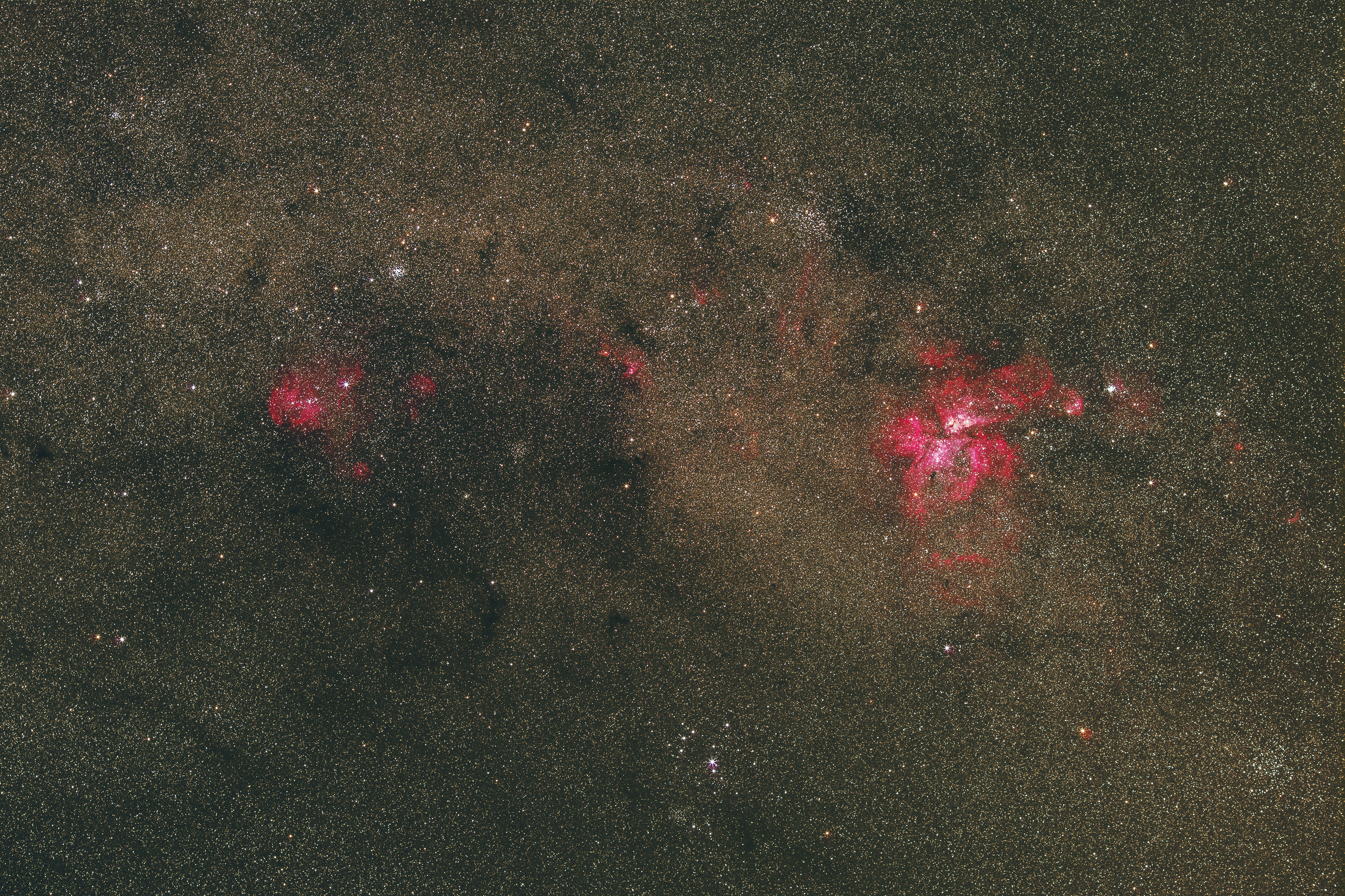 Dieses Sternfeld der südlichen Milchstraße enthält (v.l.n.r.) die beiden bekannten Emissionsnebel IC 2944 (Running Chicken Nebel) und NGC 3372 (Eta Carinae Nebel) sowie am unteren Bildrand die südlichen Plejaden (IC 2602).