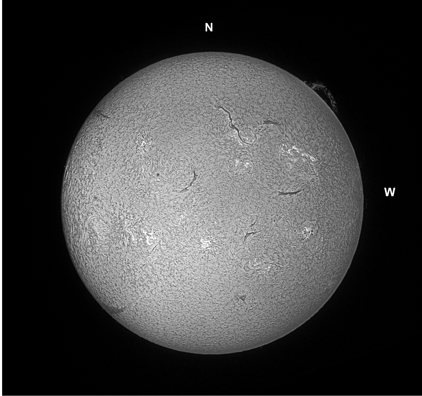 Nach einer längeren Ruhephase hat die Aktivität auf der Sonne Ende April wieder zugelegt. Auf der H-Alpha-Aufnahme zeigt sich die Chromosphäre wieder mit etlichen Fackelgebieten und Filamenten, und zusätzlich ziert den Sonnenrand eine schöne bogenförmige Protuberanz.