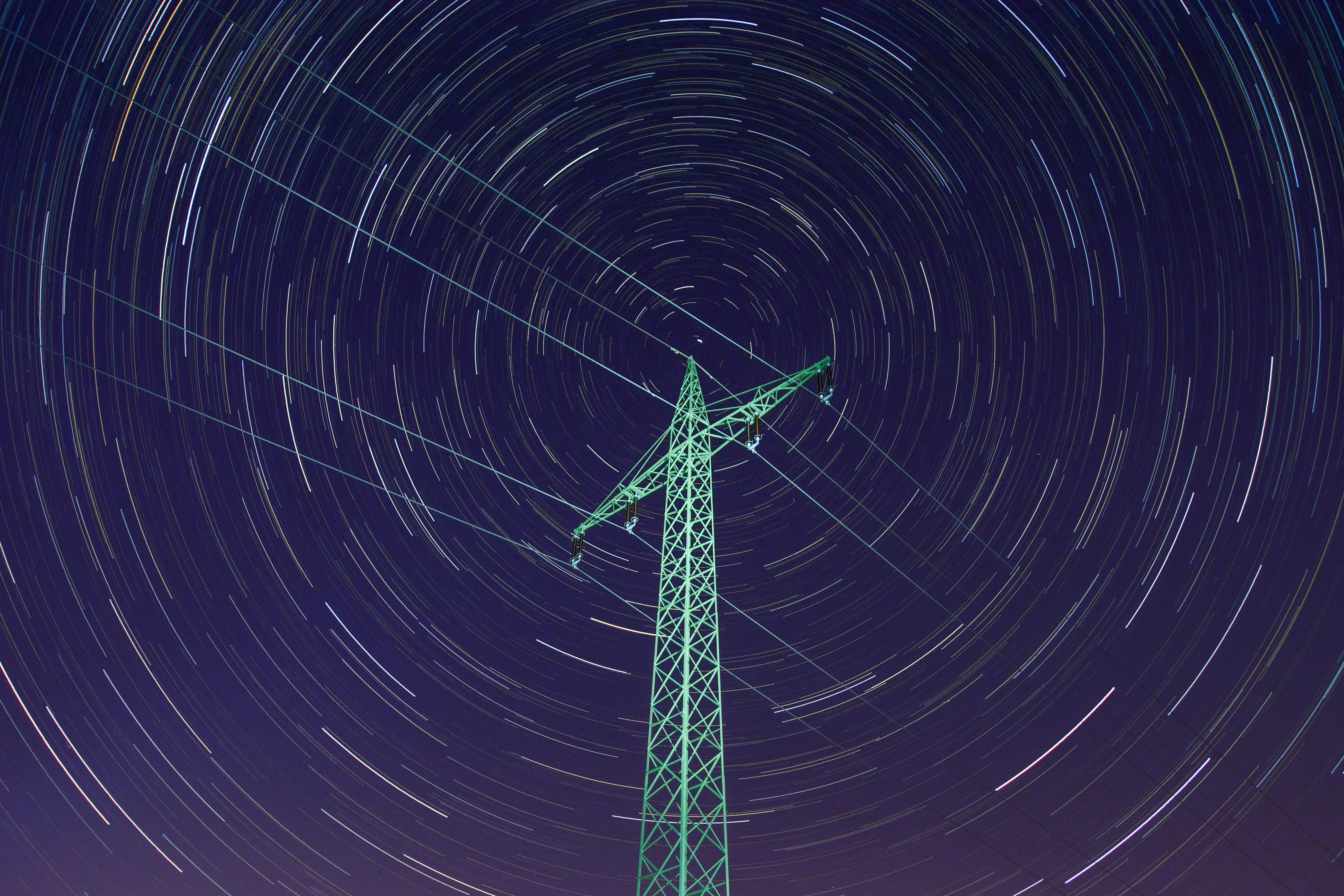 Bei dieser Startrails-Aufnahme kam es mir darauf an, dass die Spitze des Strommasts mit der Verlängerung der Erdachse zusammenfällt. Dadurch wollte ich eine optische Verbindung schaffen zwischen der Energie der Stromversorgung und den Kräften des Weltalls.