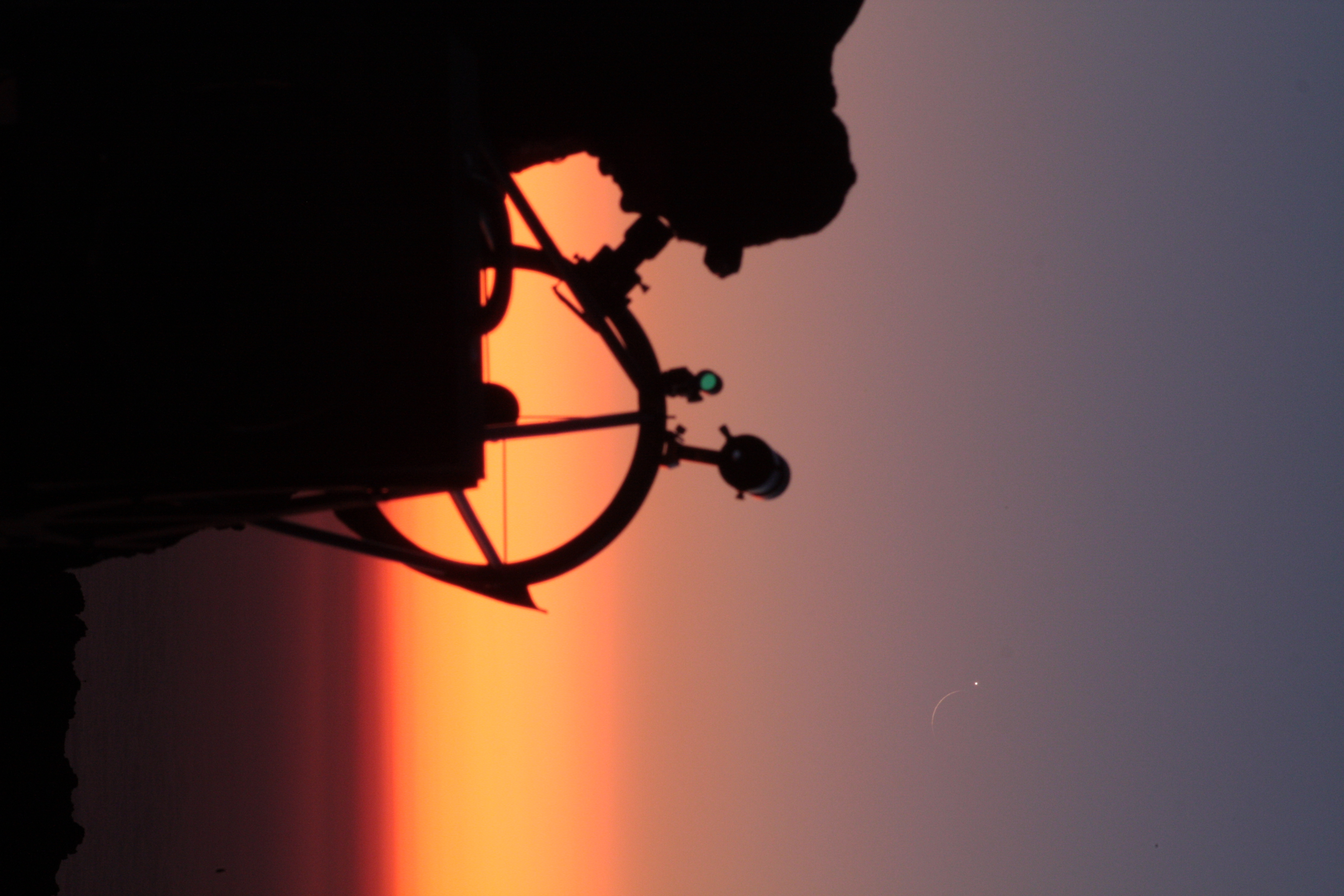 Am frühen Morgen des 30. Juni 2011 konnten wir Venus und die schmale Mondsichel 26 Stunden vor einer partiellen Sonnenfinsternis vom Roque de los Muchachos (2426 Meter) auf der Kanareninsel La Palma beobachten. Die beiden Himmelskörper standen nur 0,3° getrennt, der Mond war nur noch zu 1,4 % beleuchtet (Daten aus calsky.com). In Deutschland war diese enge Konjunktion leider nicht zu sehen: Zum Zeitpunkt der Aufnahme stand hierzulande die Sonne bereits am Himmel.