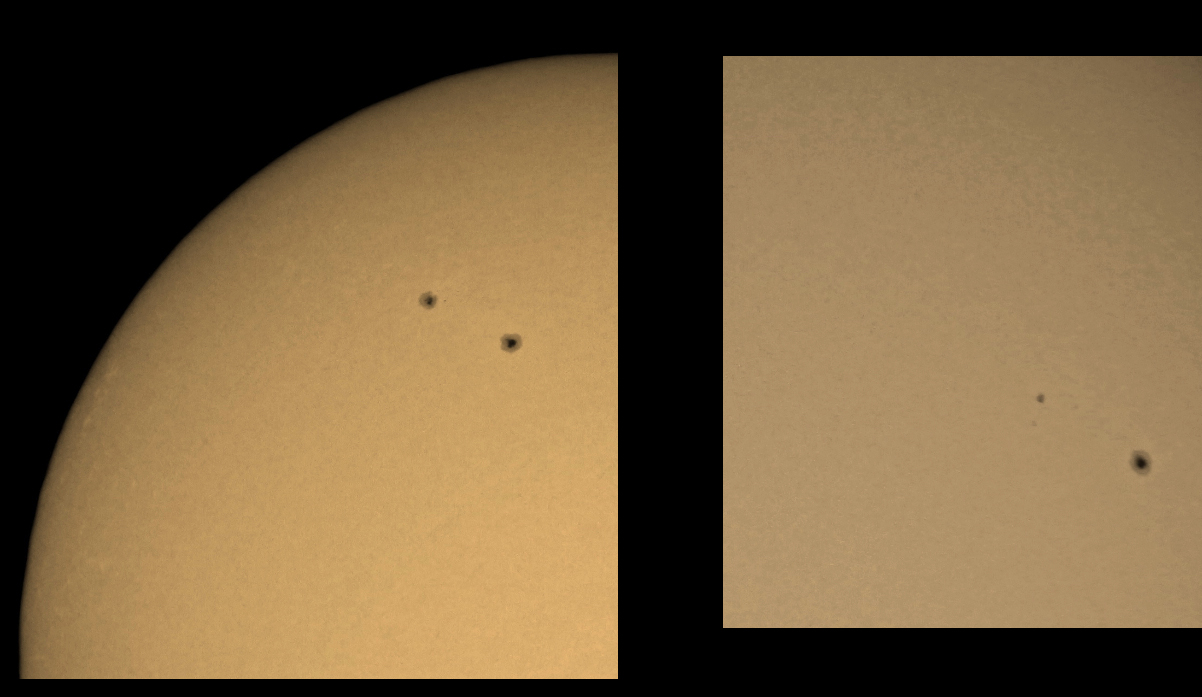 Ich habe am 20. und am 24. März 2016 die Fleckengruppe 2524 fotografiert. Das Foto dokumentiert, wie ein großer Fleck innerhalb von wenigen Tagen fast verschwindet.