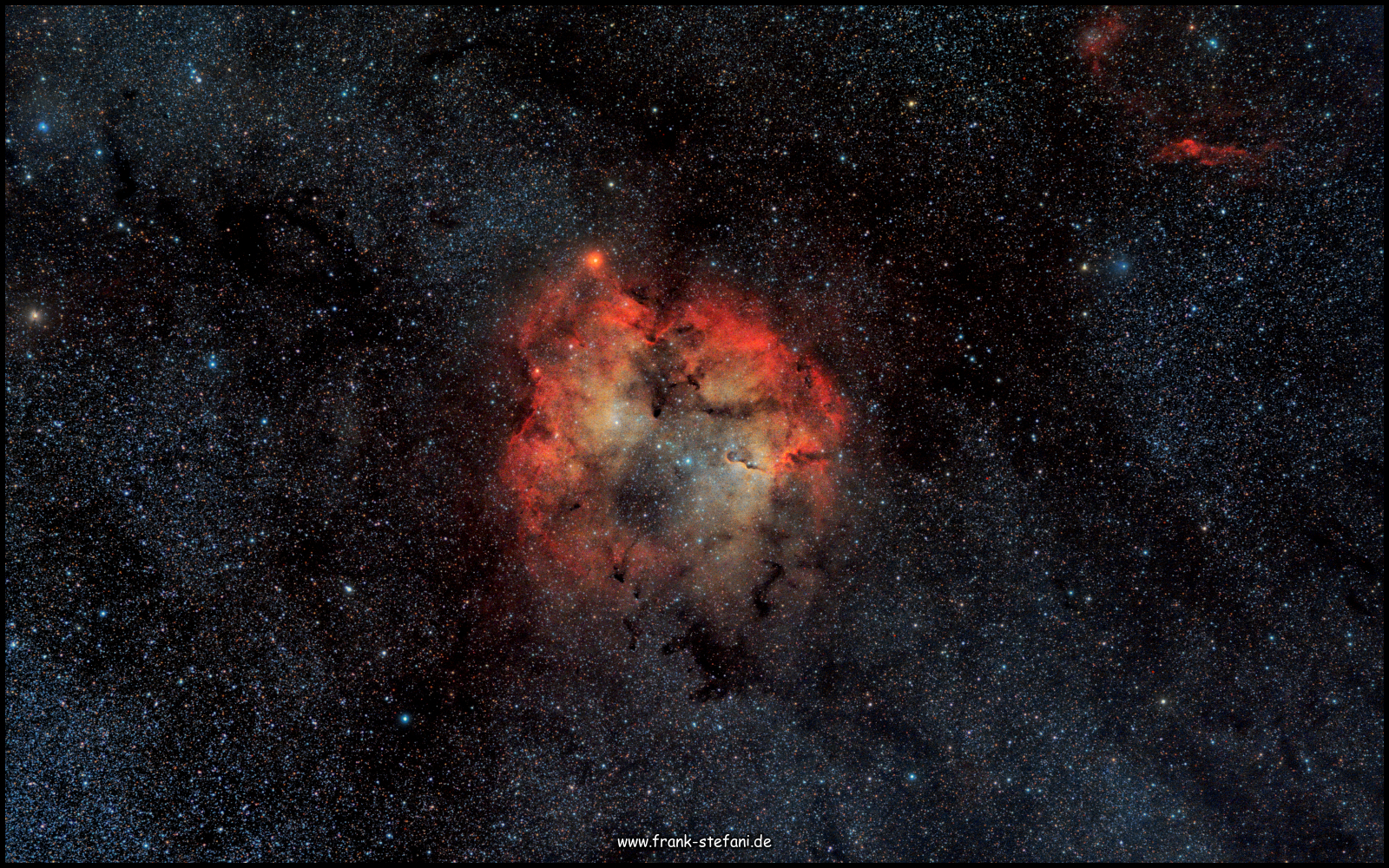 Erakis (μ Cep), wegen seiner rotgoldenen Farbe auch Granatstern genannt, ist ein 4,2 mag heller pulsierender Doppelstern im Sternbild Kepheus. Er liegt am nördlichen Rand der ausgedehnten HII-Region LBN 455, die auch den so genannten Elefantenrüssel-Nebel (IC 1396) beheimatet. Wie so oft, war der Himmel um Vollmond herum wolkenlos – in der Nacht vom 9. zum 10. August 2022 war er noch zu über 90% beleuchtet – so dass nur die hellsten Sterne gut zu sehen waren. In der Hoffnung, diese schöne Region dennoch fotografieren zu können, belichtete ich 80 x 180 s (4 Std) mit meiner zwölf Jahre alten, nicht modifizierten Canon EOS 7D (erste Version). Auf den dreiminütigen RAW-Einzelbildern war LBN 455 nur mit Mühe und kaum wahrnehmbar zu erahnen.