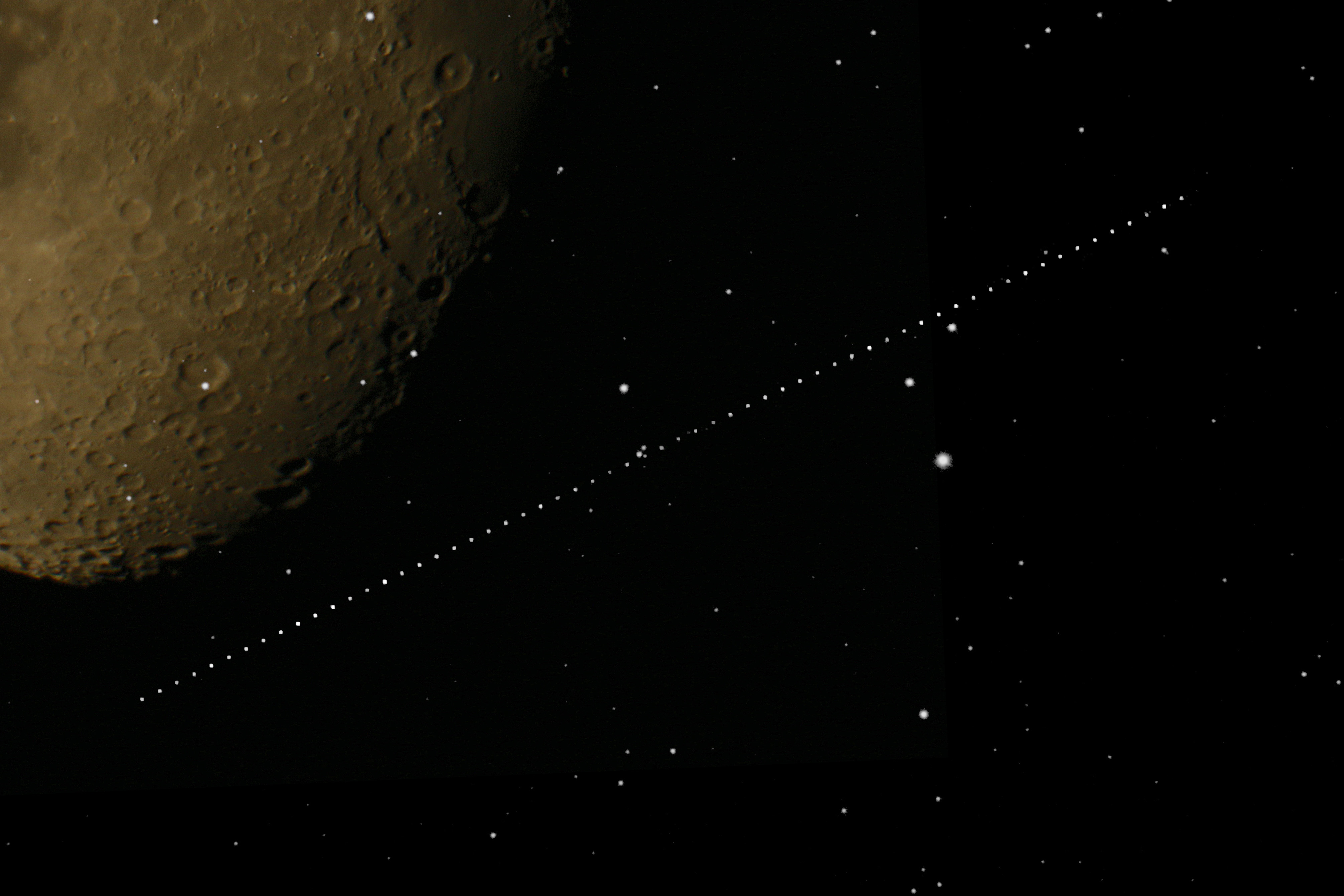 Asteroid (143649), "empfohlen" in Sterne und Weltraum 09/2021, durchfliegt den unteren Rand des Sternbildes Andromeda, am Abend des 25.9.2021. Die Einzelaufnahmen dieses Gesamtbildes wurden im Abstand von einer Minute gemacht, insgesamt wird eine Stunde abgedeckt, in der der Erdbahnkreuzer 23 Bogenminuten zurückgelegt hat. Der eingeblendete Mond war weit entfernt, er dient hier nur dem Größenvergleich. Der hellste Stern ist etwa 8 mag hell, der Asteroid zeigt sich mit 14 mag.