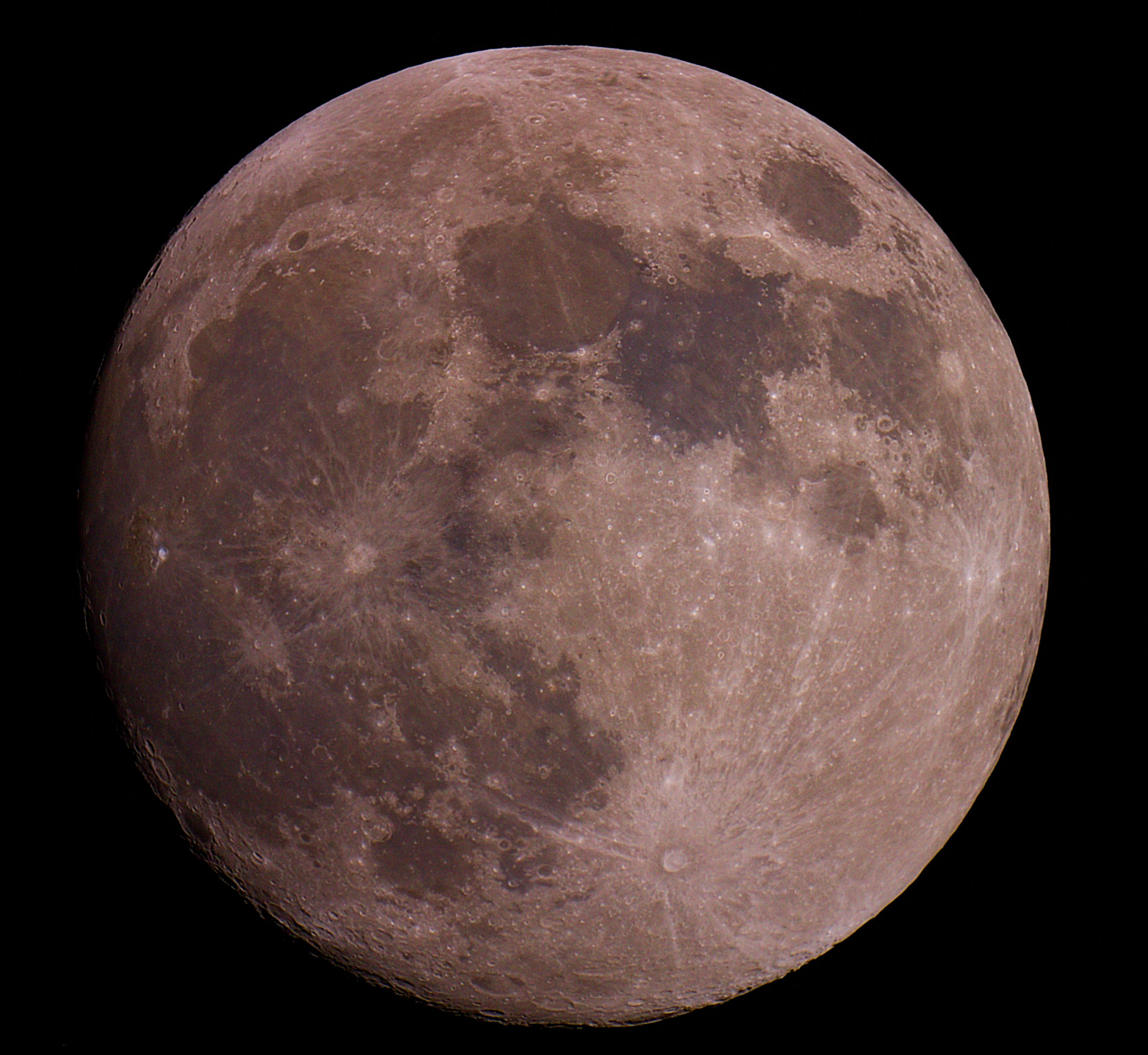 Unser Erdmond im Dezember 2021, zunehmend 2. Viertel, 98,6%. Das Bild wurde in den Farben verstärkt, um den so genannten "Mineral Moon" dazustellen. Die Färbung wurde nur verstärkt, nicht verfälscht. Aufgenommen wurde eine Einzelbelichtung. Es war spannend zu sehen, welches Ergebnis mit einem kleinen Teleskop ohne Nachführung als Einzelbild erzielt werden kann.