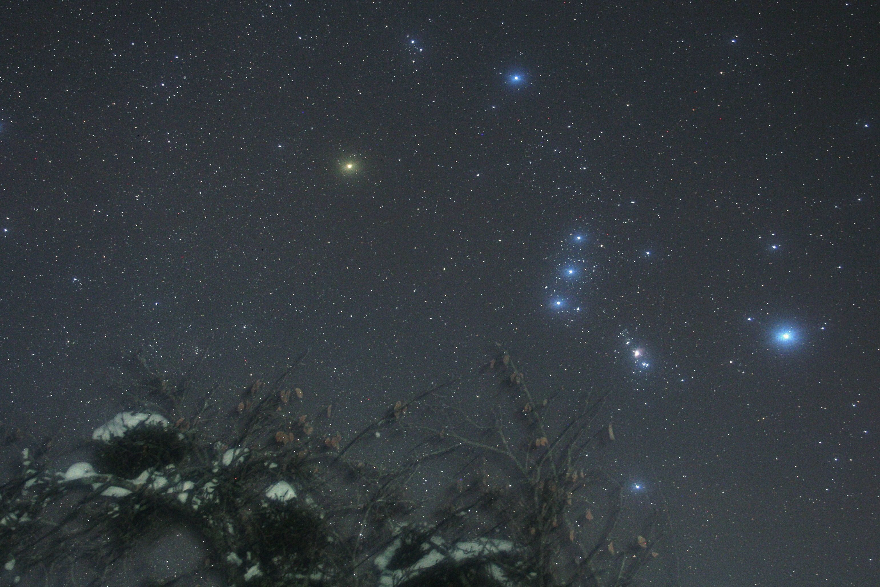 Um die markanten Sterne des Orions sowie deren Farben besser hervorzuheben, benutzte ich einen Nebeleffektfilter vor dem Objektiv. Um die Äste im Vordergrund "einzufrieren", blitzte ich den Baum am Anfang der Belichtung an.