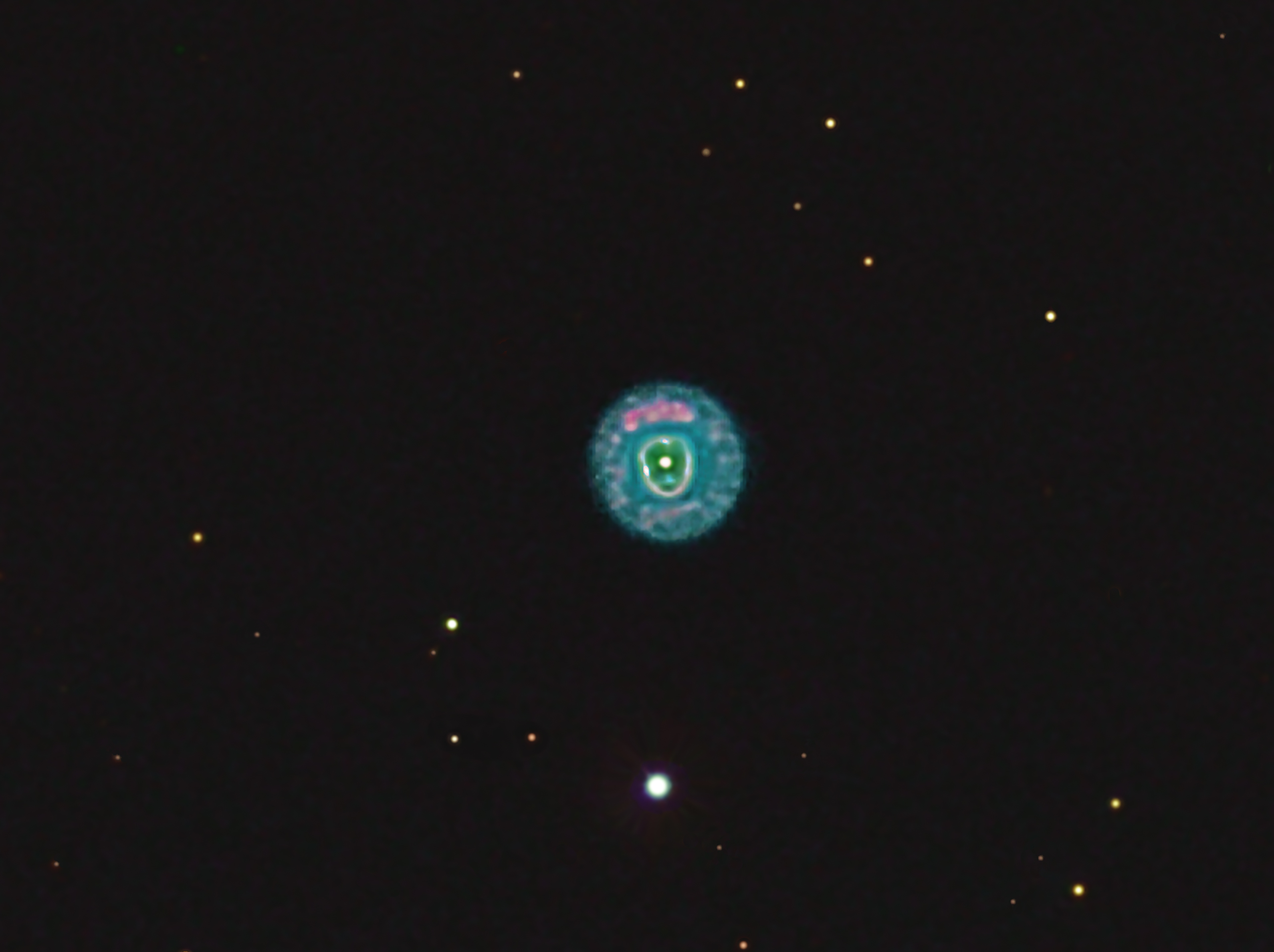 Das Foto wurde im Frühjahr an einem klaren Abend bei uns in Norddeutschland aufgenommen. Da der scheinbare Winkeldurchmesser von NGC 2392 nicht einmal eine Bogenminute beträgt, erscheint er trotz einer Brennweite von 2,4 Metern sehr klein bei normaler Bildgröße. Daher wurde hier ein vergrößerter Ausschnitt gewählt.