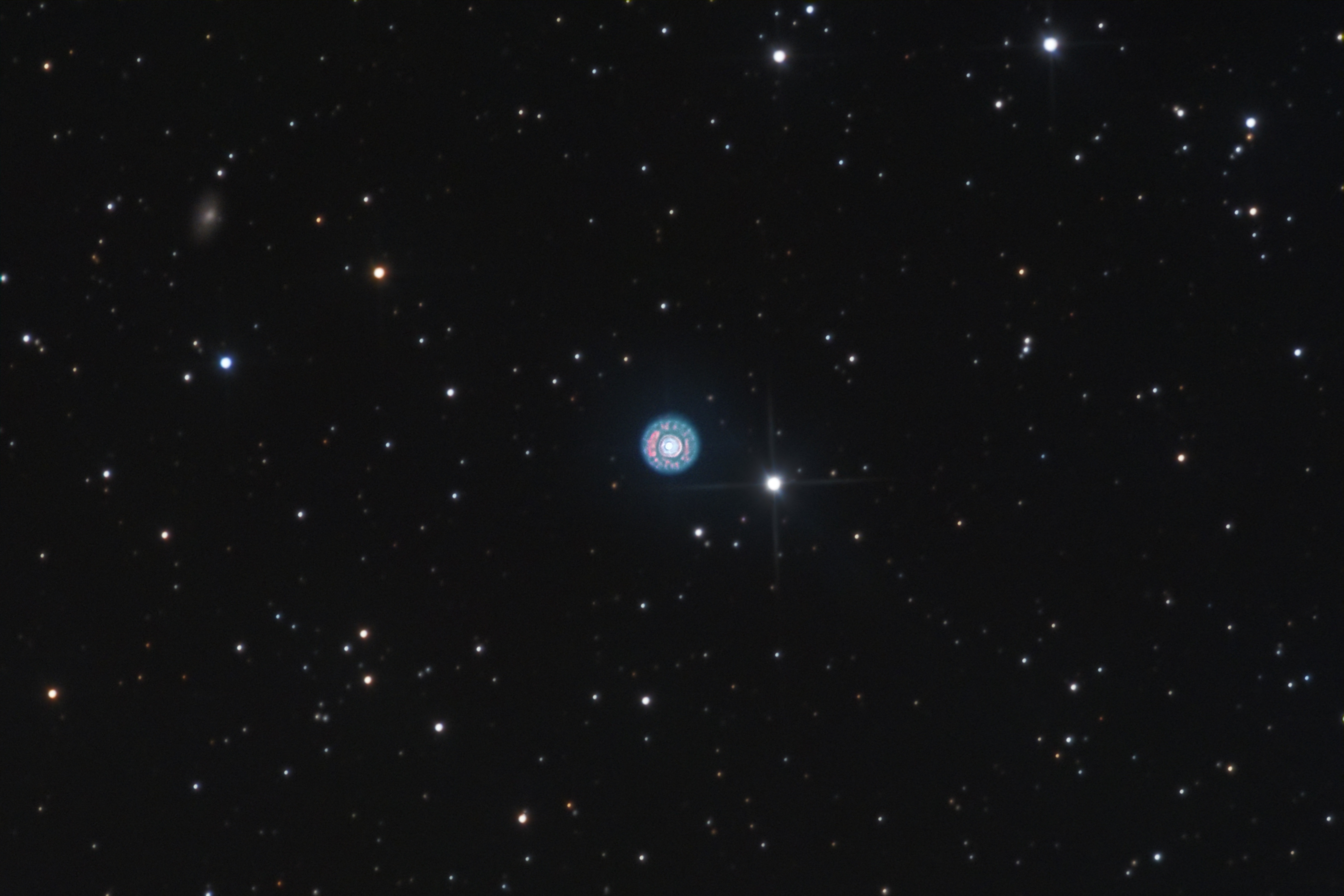 Der Eskimonebel ist mit 47 x 43 Bogensekunden ein recht kleiner Planetarischer Nebel. Auch wenn er andererseits mit etwa 9 mag recht hell ist, so ist eine Fotografie mit Strukturen anspruchsvoll. Mit Zweifach-Telekonverter und Drizzle-Verfahren gelang es mir dennoch, signifikante Strukturen hervorzuheben.