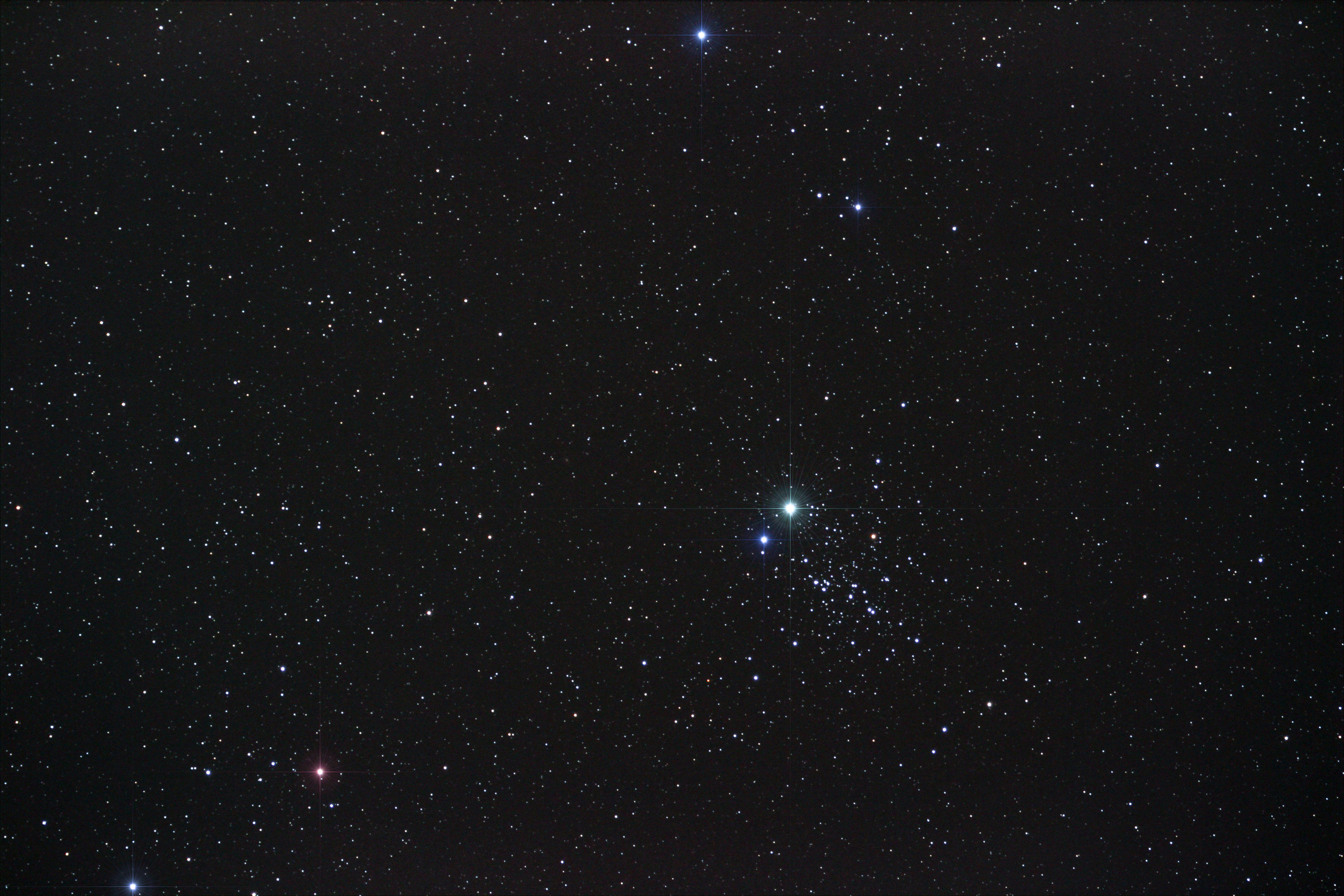 NGC 457 – Dieser offene Sternhaufen im Sternbild Kassiopeia wird auch noch Eulenhaufen genannt. Mit etwas Fantasie erkennt man dann tatsächlich die Ähnlichkeit mit einer Eule, die ihre Flügel ausbreitet. Irgendwie verwunderlich, dass Herr Messier ihn nicht in seinem Katalog hatte, da es sich doch um einen hellen und auffälligen Sternhaufen handelt.