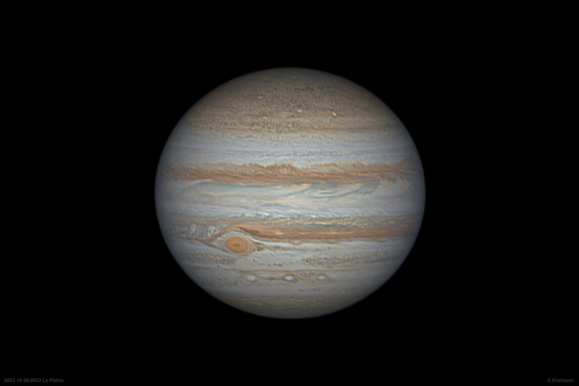 Am 30. Oktober 2023 war das Seeing gegen 0022 UT auf La Palma Kanaren für ein paar Minuten fast perfekt. In dieser Zeit gelang mir diese sehr detaillierte Aufnahme von Jupiter, die enorm viele Strukturen selbst in den Polregionen zeigt.