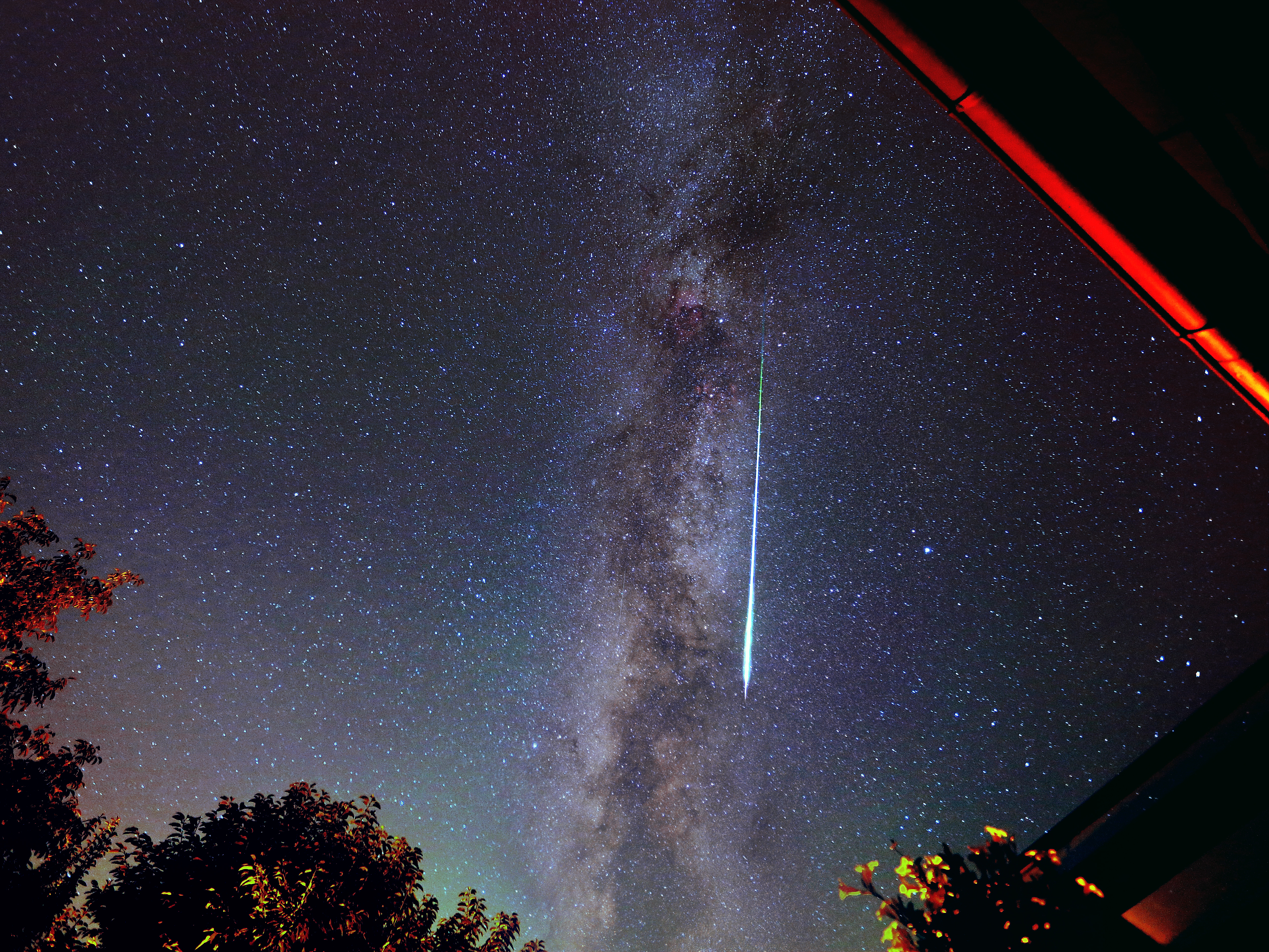 Gegen 1:00 zog dieser gleißend helle Perseid über Wurmlingen bei Tübingen hinweg durch das Sternbild Schwan. Der in dieser Nacht besonders klare und dunkle Himmel erlaubte anschließend noch über drei Minuten die Beobachtung der Nachleuchtspur dieses Boliden.