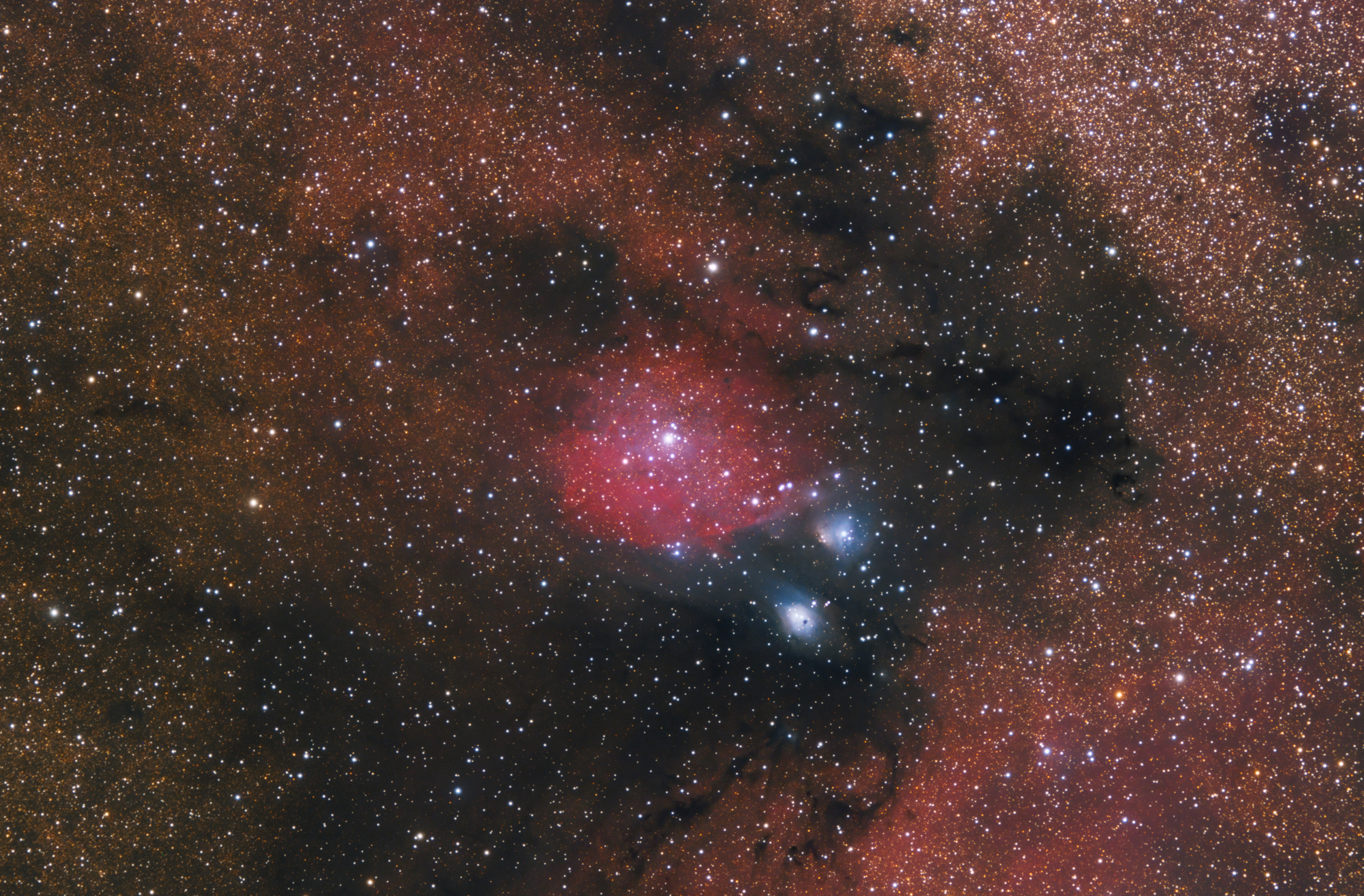 Neben der Schildwolke findet sich ein farbiges Dreiergespann NGC 6589, NGC 6590 und IC 1284.