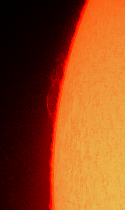 … hätte ich die zarte und kleine Protuberanz gegenüber der Seite mit den heute domierenden Eruptionen. Tatsächlich fand ich diese aber besonders reizvoll (visuell und Bild ist eben immer noch ein Unterschied) und erkläre sie hiermit zu meinem heutigen Favoriten.