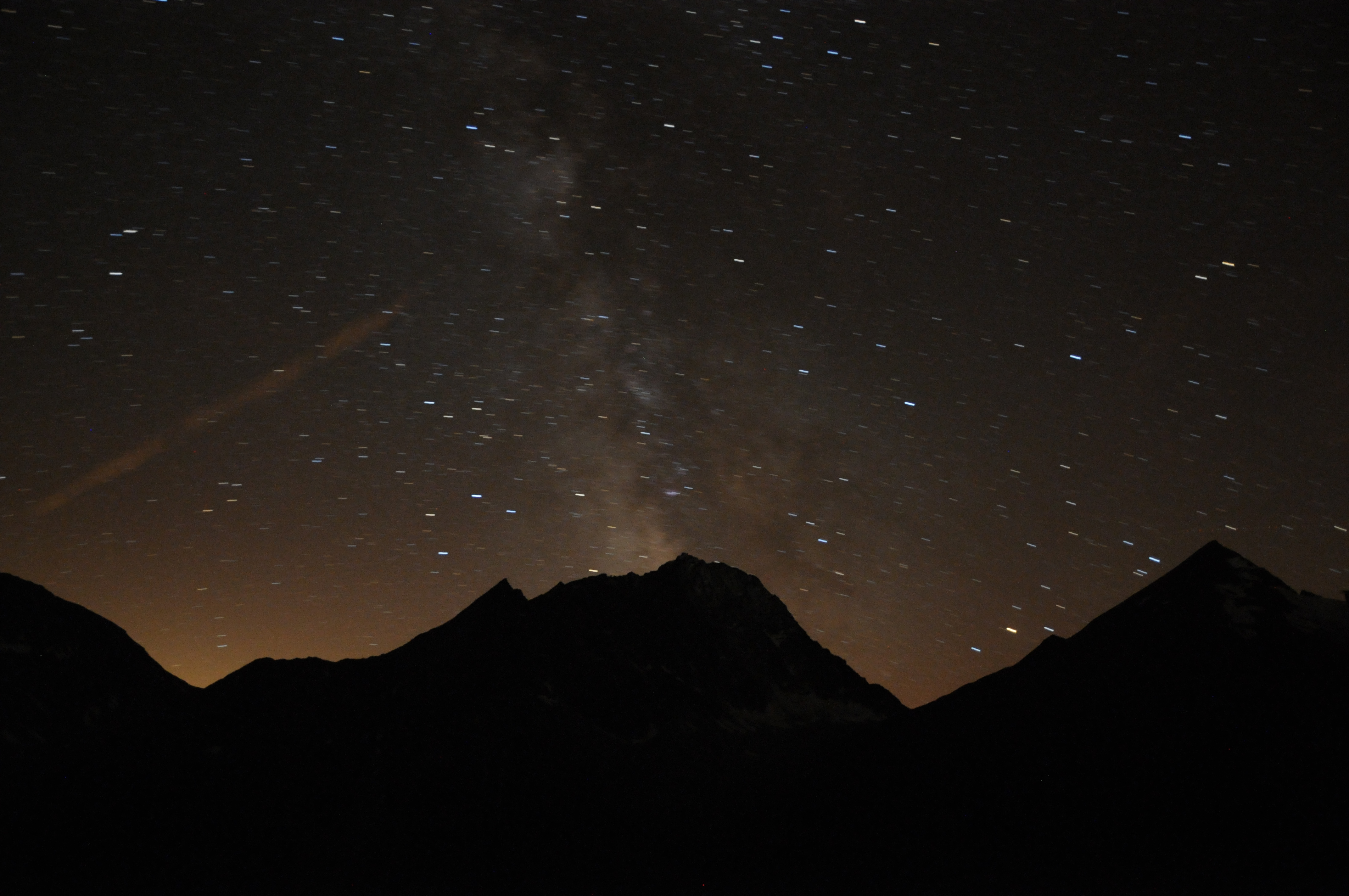 Die Milchstraße über dem Mont Gelé (auf deutsch: dem Gefrorenen Berg) im Unterwallis sieht aus wie eine Dampffahne aus dem Krater eines Vulkans mit abgesprengter Spitze. Aufgenommen von der Chanrion-Hütte aus; der Lichtschein des Aostatals färbt den Himmel rötlich.