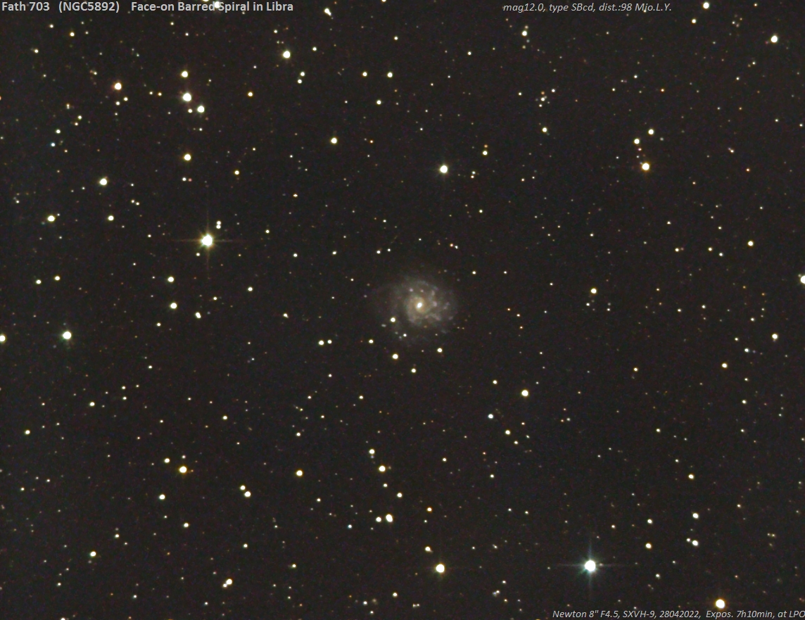 Exakt mittig auf der Verbindungslinie Alpha-Gamma Librae (Deklination -16 Grad) liegt diese kleine, relativ unbekannte, etwas asymmetrische Balkenspirale mit der NGC-Nummer 5892, oder auch, nach dem deutsch-amerikanisch stämmigen Astronomen Edward Arthur Fath (1880 - 1959) als Nummer 703 in seinem Werk (1914) "A Study of Nebulae" aufgenommen. Bereits ab 1908 arbeitete er am Lick-Observatory und nahm mit dem 36-Zoll-Crossley-Reflektor Spektren von Galaxien, darunter auch M31, auf. Dabei sah er, dass sämtliche Spektren einen kontinuierlichen Verlauf mit Absorptionslinien aufwiesen und auf eine Ansammlung von unzähligen Sternen deuteten - ein ähnliches Ergebnis erhielt auch Julius Scheiner an der Berliner Sternwarte in Potsdam. Er bestimmte auch Radialgeschwindigkeiten (damals ein Schwerpunkt der Arbeit am Lick-Observatorium unter seinem Direktor W. W. Campbell). Die waren allerdings (richtigerweise) sehr hoch, so dass er seine Ergebnisse nicht Ernst nahm und nicht weiter verfolgte. So verpasste er die Chance, die 1912 Vesto Slipher 1912 am Lowell-Observatorium zum ersten Hinweis auf die Flucht der Spiralnebel führte. Mit den Ergebnissen von Slipher und deren Weiterverfolgung, der am Mt. Wilson von M. Humason bestimmten Radialgeschwindigkeiten von weiter entfernten Galaxien und deren Entfernungsbestimmung durch E. Hubble, konnte dieser 1929 sei berühmtes Expansionsgesetz präsentieren. E. A. Fath ist bekannt für: 1. Spiralnebel haben kontinuierliche Spektren wie Kugelsternhaufen; 2. Als Ausnahme zeigen manche Spiralnebel breite Emissionslinien (später Seyfert-Galaxien genannt); 3. Das Spektrum des Zodiakallichtes ist reflektiertes Sonnenlicht; 4. Es gibt veränderliche Sterne mit mehr als zwei Pulsationsperioden; 5. Konstruktion und Bau eines der ersten lichtelektrischen Photometer in den USA. Fath 703 wurde bereits 1886 von Ormond Stone entdeckt, er war ein Astronom und Direktor des Cincinnati-Observatoriums 1875. Der scheinbare Durchmesser beträt 3,6 x 2,9 Bogenminuten (linear 105000 Lichtjahre), und zeigt ausgedehnte Sternentstehungsgebiete.