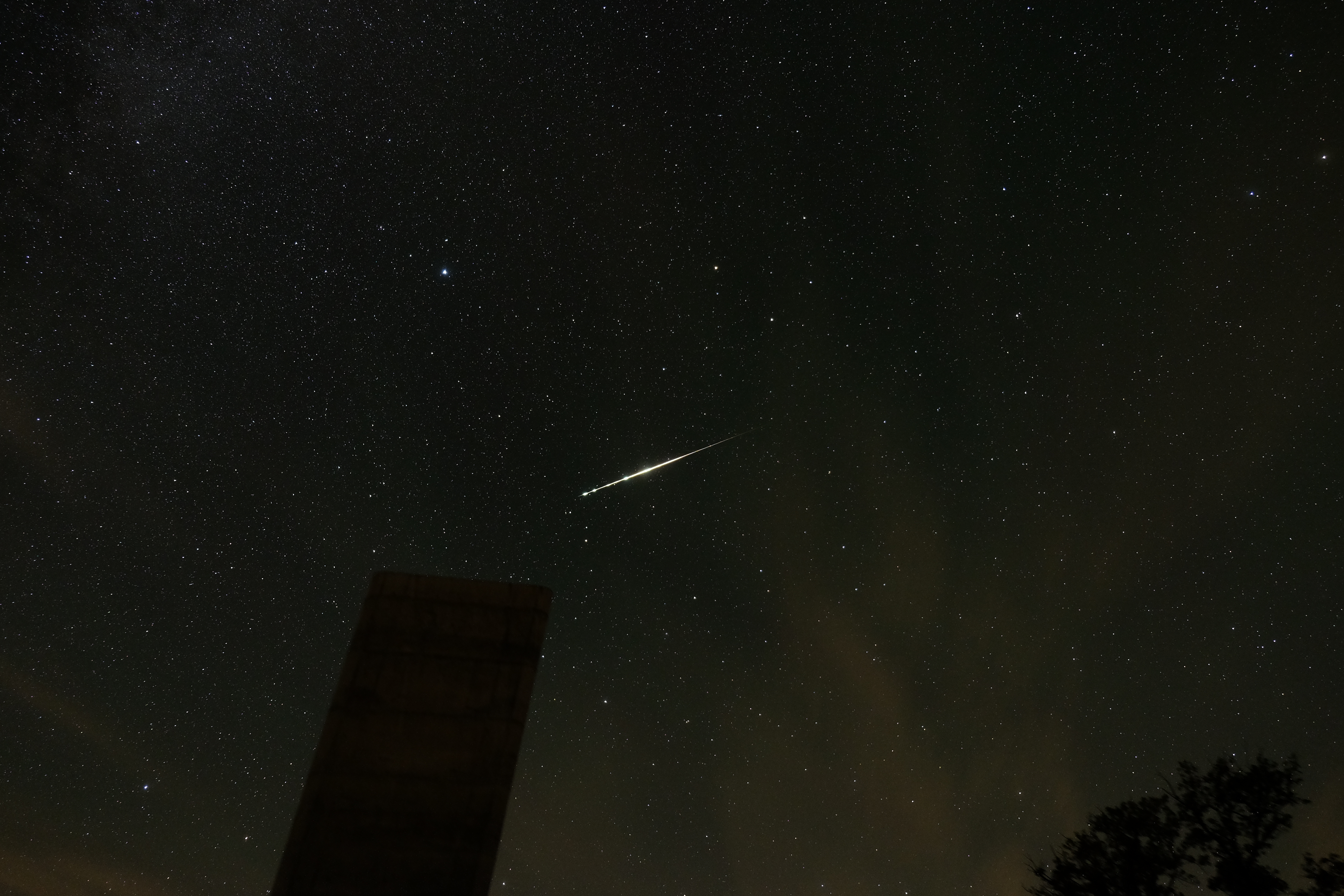 Mit Sternenfreunden aus Halle war ich unterwegs, um die diesjährigen Perseiden zu beobachten und zu fotografieren. Als in der Nacht die Rückfahrt beschlossen wurde, habe ich Stativ und Kamera während des Zusammenpackens schnell nochmal in eine andere Richtung gedreht. Und dann nach kürzester Zeit dieser glückliche Schnappschuss. Das Besondere dabei ist auch der Aufnahmeort. Dabei handelt es sich um den Mittelberg bei Nebra. Das ist die Stelle, an der seinerzeit die Himmelsscheibe entdeckt wurde. Im Vordergrund ist der auf dem Mittelberg errichtete Aussichtsturm zu erkennen. Besonders eindrucksvoll war es für mich, dass ich die Feuerkugel gleichzeitig visuell beobachten konnte. Ein unvergesslicher Moment.