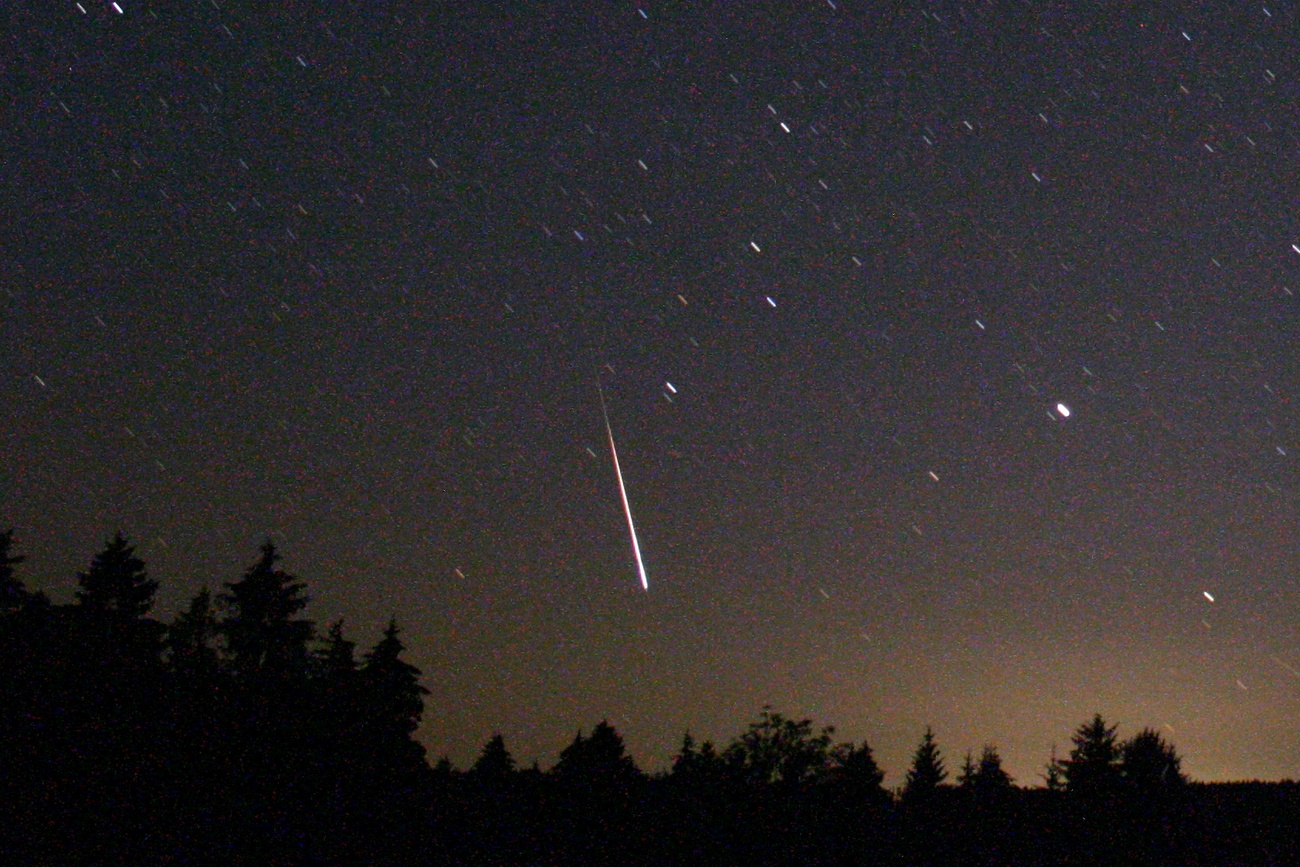 Eine Feuerkugel knapp über dem Horizont in westlicher Richtung von meinem Standort in Oberösterreich aus. Die FK produzierte eine Rauchspur, welche fotografisch etwa 12 min sichtbar ist.