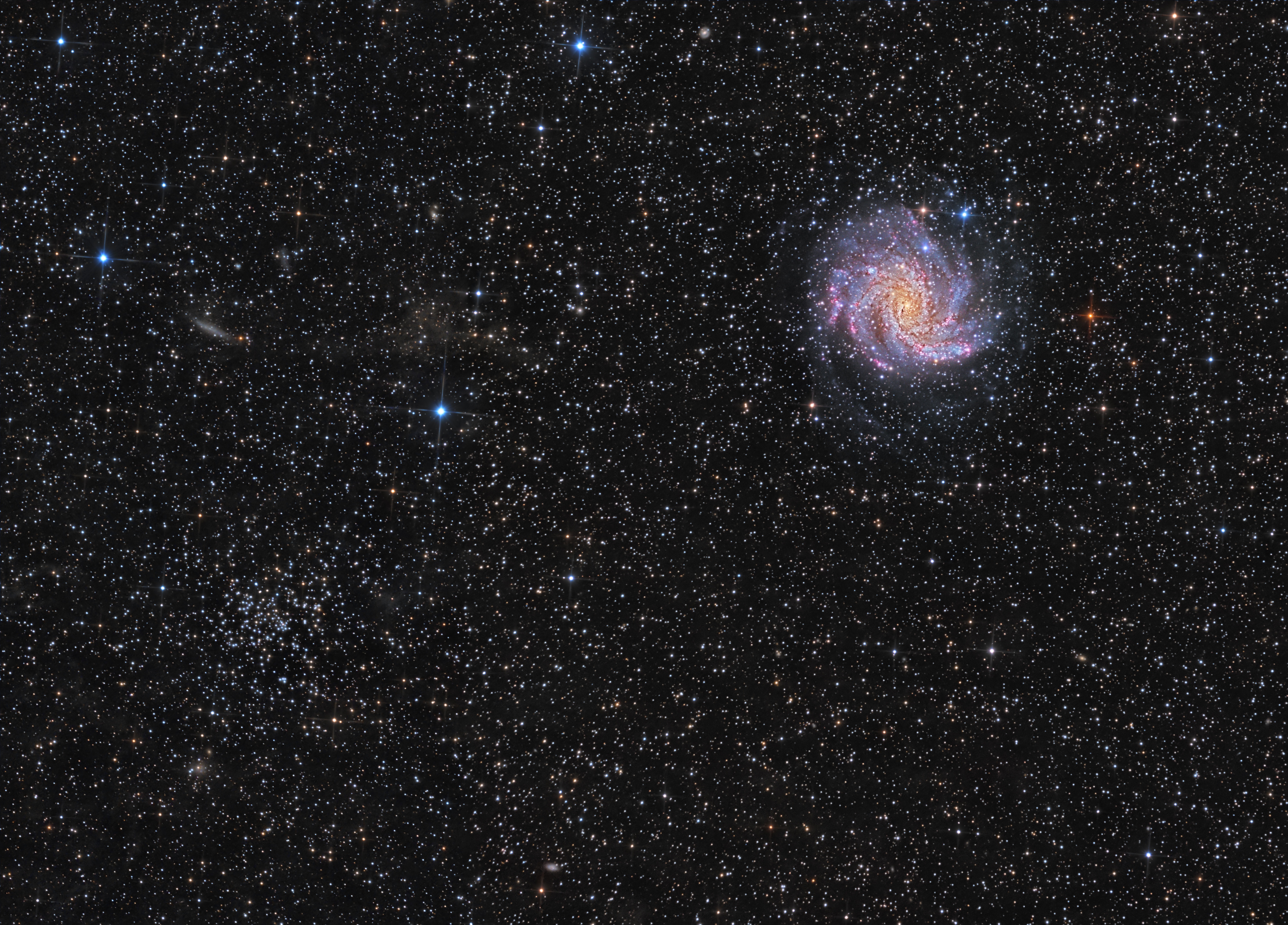 Meine Ziele für diese Aufnahme waren zum einen in der Feuerwerksgalaxie (NGC 6946) die Sternentstehungsgebiete durch Aufnahmen mit Filter gegen Lichtverschmutzung besser zur Geltung zu bringen und zum anderen sollte der nahe gelegene offene Sternhaufen NGC 6939 mit ins Bild kommen. Ich erstellte hierzu neben Aufnahmen der Galaxie auch noch welche von NGC 6939, die sich gut überlappen und so zum Mosaik zusammengefügt werden konnten. Praktischerweise waren so auch frühere Bilder der Feuerwerksgalaxie nutzbar, um das Rauschen zu verbessern.