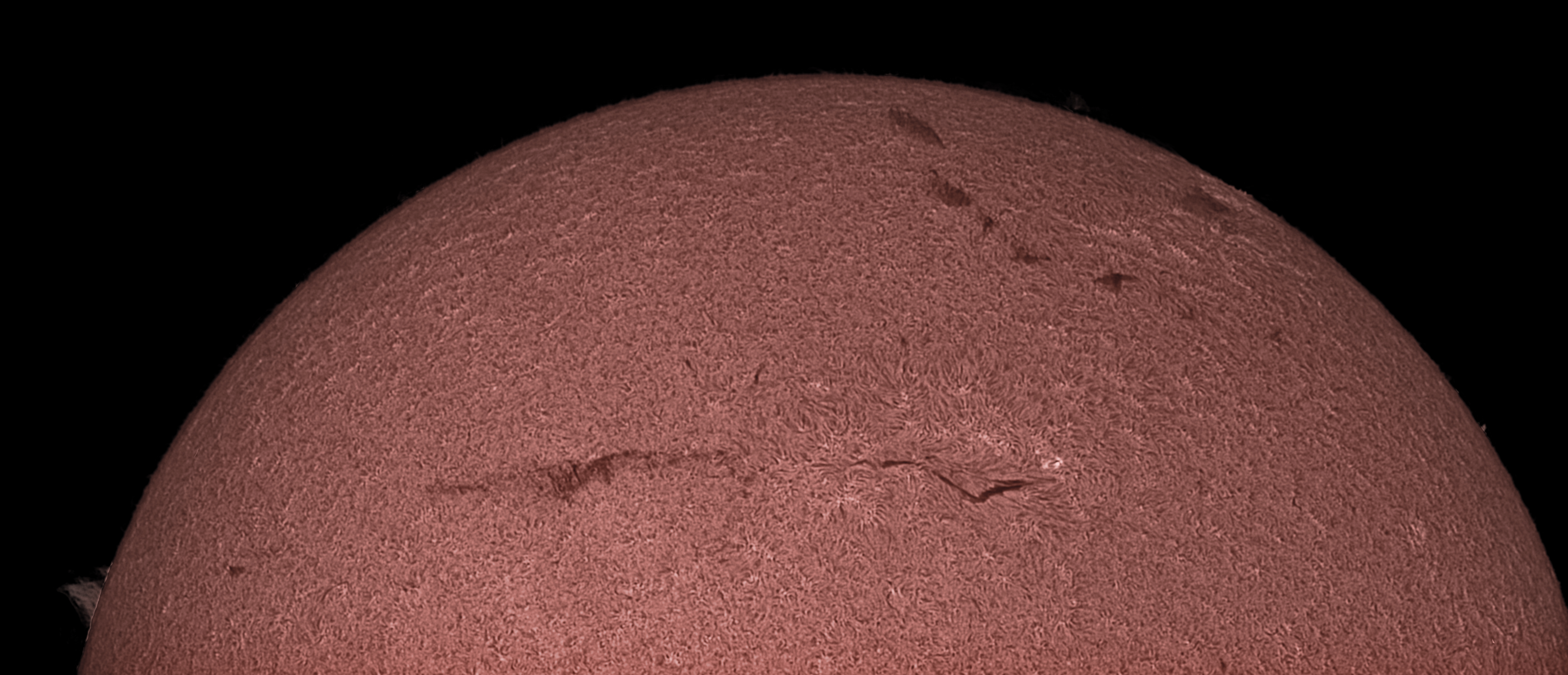 Ein langgestrecktes Filament zeigte sich am 12. September 2021 auf der nördlichen Hälfte der Sonnenscheibe. Fleckenbildung erfolgte in diesem Bereich nicht. Die Länge entspricht etwa 42 Erddurchmessern, also rund 530000 km. Aufnahmezeit 08:13 UT.