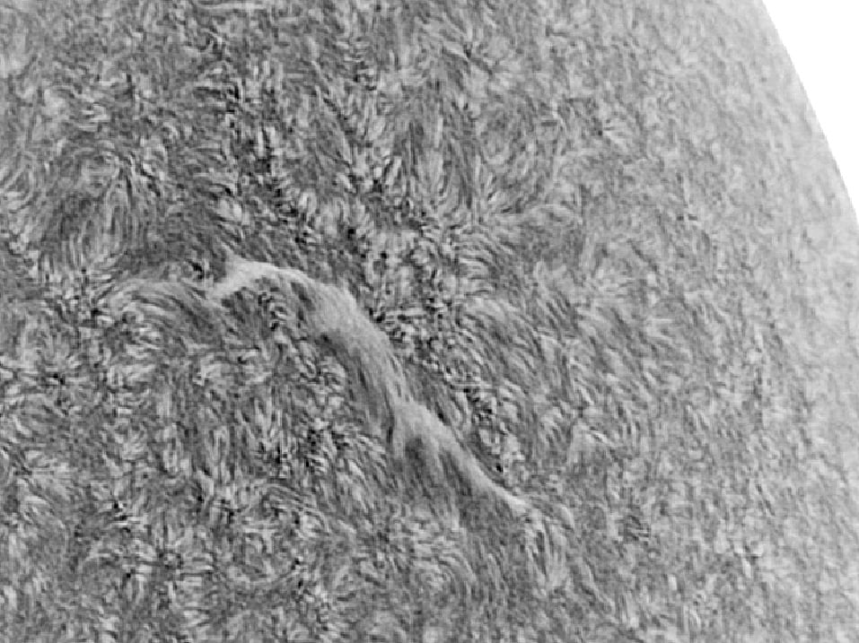 Derzeit ist ja auf der uns zugewandten Seite der Sonne nicht viel los an Flecken oder Flaregebieten. So habe ich mir ein Filament vorgenommen und zur besseren Wirkung das Bild invertiert.