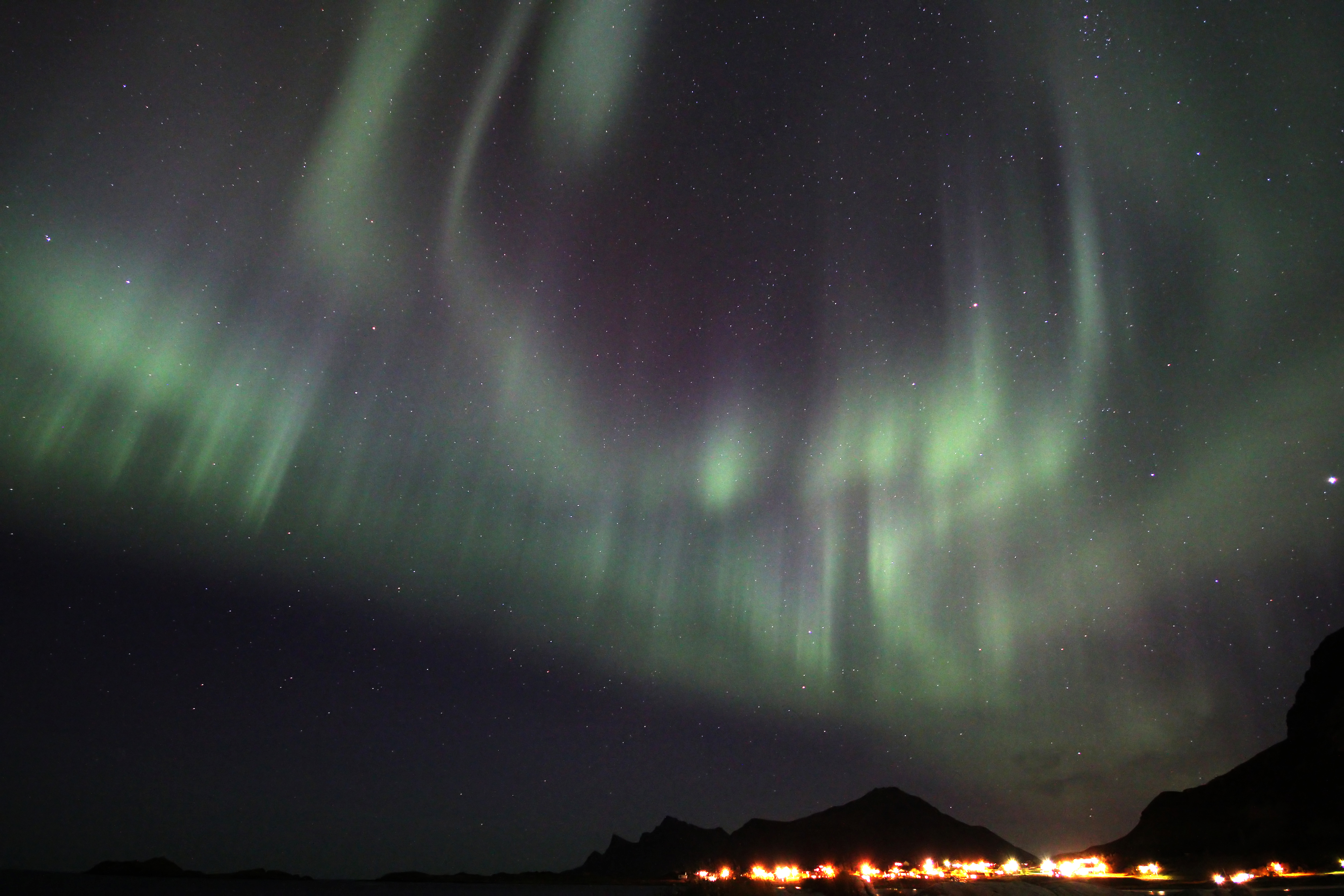 Einem riesigen Insekt gleich schwebt ein filigranes und reich strukturiertes Polarlicht beinahe unbeweglich über dem Lofotenarchipel. Mehr Bilder finden Sie auf www.zumnordlicht.com